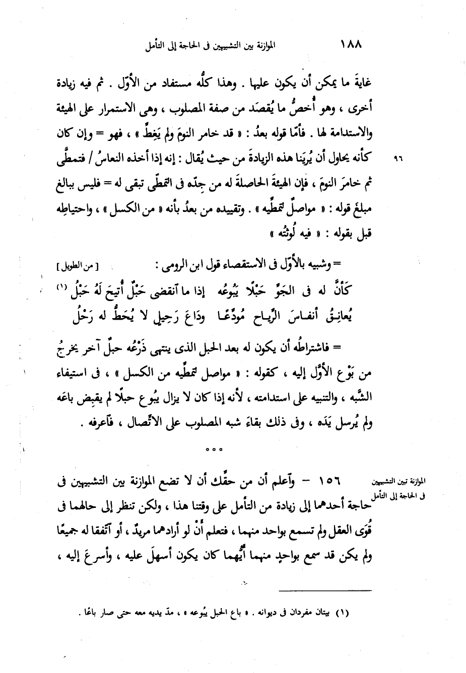 واعلم أن من حقِّك أن لا تضع الموازنة بين التشبيهين في حاجة أحدهما إلى زيادة من التأمل على وقتنا هذا ولكن تنظر إلى حالهما في قُوَى العقل ولم تسمع بواحد منهما، فتعلم أَنْ لو أرادهما مريدٌ، أو اتّفقا له جميعاً ولم يكن قد سمع بواحدٍ منهما أيُّهما كان يكون أسهلَ عليه، وأسرعَ إليه،