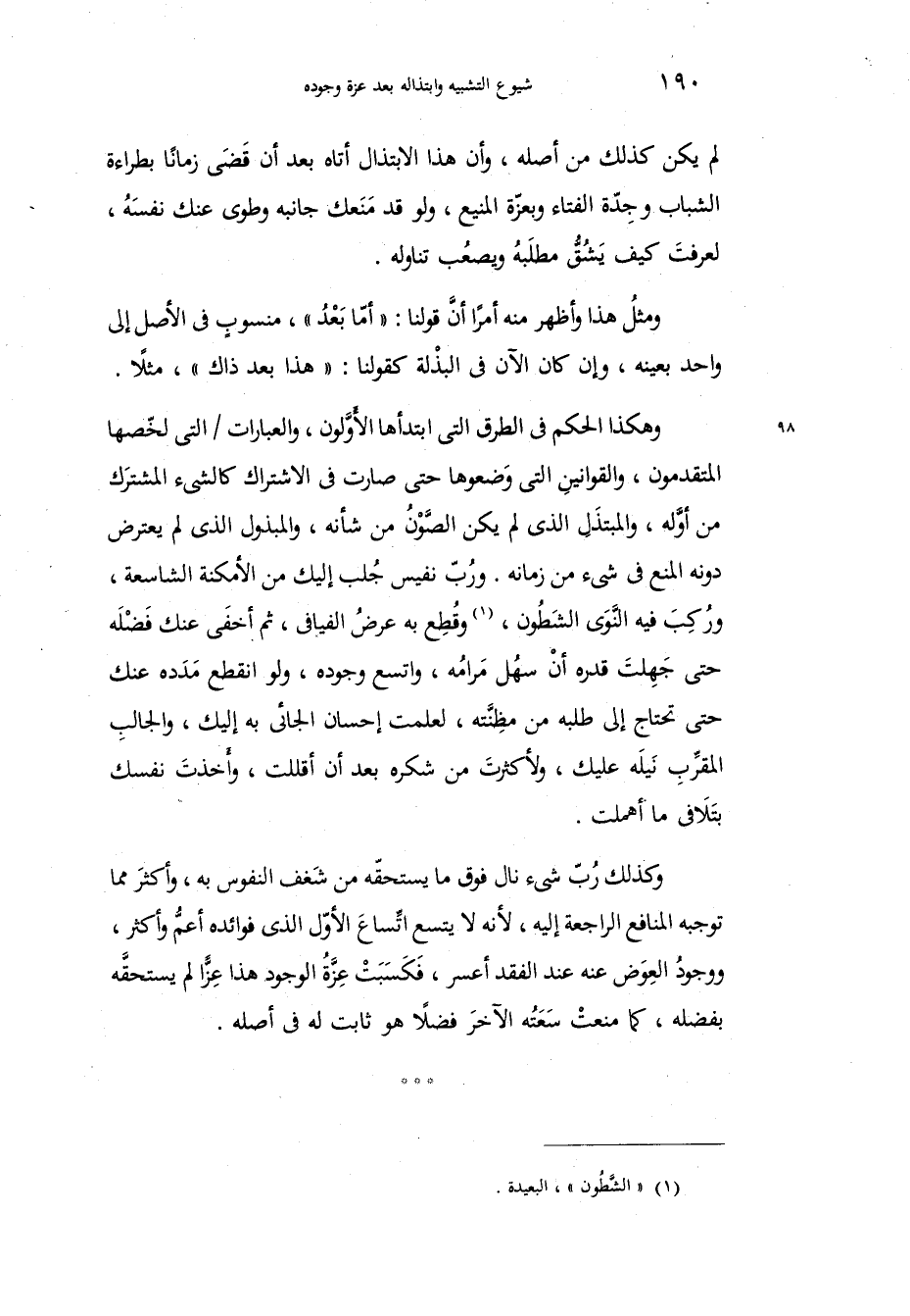 لم يكن كذلك من أصله، وأن هذا الابتذال أتاه بعد أن قَضَى زماناً بطراءة الشباب وجِدّة الفتاء وبعزّة المنيع، ولو قد مَنَعك جانبه وطوى عنك نفسَهُ، لعرفتَ كيف يَشُقُّ مطلَبهُ ويصعُب تناوله، ومثلُ هذا وأظهر منه أمراً أنَّ قولنا أمّا بَعْدُ، منسوبٍ في الأصل إلى واحد بعينه، وإن كان الآن في البذْلة كقولنا هذا بعد ذاك، مثلاً، وهكذا الحلم في الطرق التي ابتدأها الأوَّلون، والعبارات التي لخّصها المتقدمون، والقوانين التي وَضعوها حتى صارت في الاشتراك كالشيء المشترَك من أوَّله، والمبتذَلِ الذي لم يكن الصَّوْنُ من شأنه، والمبذول الذي لم يعترض دونه المنع في شيء من زمانه، ورُبّ نفيس جُلب إليك من الأمكنة الشاسعة، ورُكِبَ فيه النَّوَى الشَطُون، وقُطِعَ به عرضُ الفيافي، ثم أخفَى عنك فَضْلَه حتى جَهِلتَ قدره أنْ سهُل مرامُه، واتسع وجوده، ولو انقطع مَدَده عنك حتى تحتاج إلى طلبه من مظِنَّته، لعلمت إحسان الجائي به إليك، والجالبِ المقرِّب نَيلَه عليك، ولأكثرتَ من شكره بعد أن أقللت، وأخذتَ نفسك بتَلاَفي ما أهملت، وكذلك رُبّ شيء نال فوق ما يستحقّه من شَغف النفوس به، وأكثرَ مما توجبه المنافع الراجعة إليه، لأنه لا يتسع اتِّساعَ الأوَّل الذي فوائده أعمُّ وأكثرُ، ووجودُ العِوَض عنه عند الفقد أعسر، فَكَسَبَتْ عِزَّْةُ الوجود هذا عِزّاً لم يستحقَّه بفضله، كما منعتْ سَعَتُه الآخرَ فضلاً هو ثابت له في أصله،