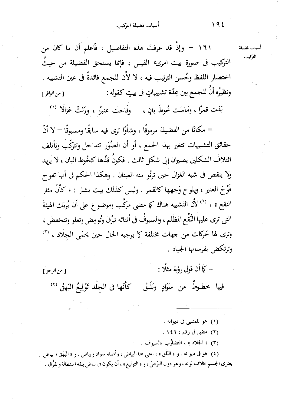 مكاناً من الفضيلة مرموقاً، وشأواً ترى فيه سابقاً ومسبوقاً لا أنّ حقائق التشبيهات تتغير بهذا الجمع، أو أن الصُوَر تتداخل وتتركّب وتأتلف ائتلافَ الشكلين يصيران إلى شكل ثالث، فكونُ قدِّها كخُوط البان، لا يزيد ولا ينقص في شبه الغزال حين ترنُو منه العينان، وهكذا الحكم في أنها تفوح فَوْحَ العنبر، ويلوح وَجهها كالقمر، وليس كذلك بيت بشار: كأنّ مثار النقع، لأن التشبيه هناك كما مضى مركَّب وموضوع على أن يُريَك الهيئةَ التي ترى عليها النَّقْع المظلم، والسيوفُ في أثنائه تبرُق وتُومِض وتعلو وتنخفض، وترى لها حَرَكات من جهات مختلفة كما يوجبه الحال حين يحمَى الجِلاد، وترتكض بفرسانها الجياد. كما أن قول رؤبة مثلاً: