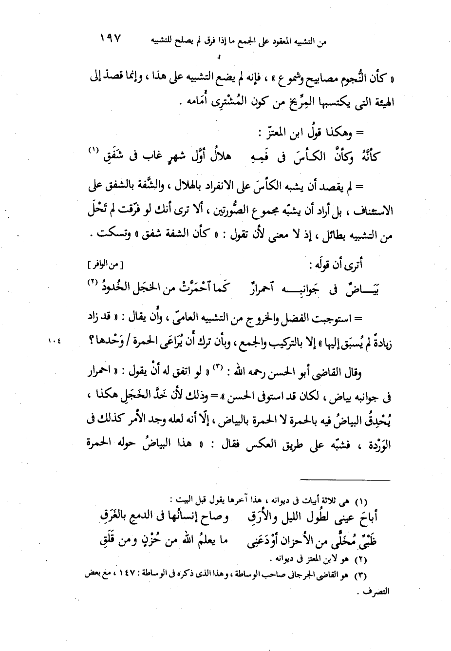 كأنّ النُّجوم مصابيح وشموع، فإنه لم يضع التشبيه على هذا وإنما قصد إلى الهيئة التي يكتسبها المِرِّيخ من كون المُشْتَرِي أمَامه، وهكذا قولُ ابن المعتزّ: