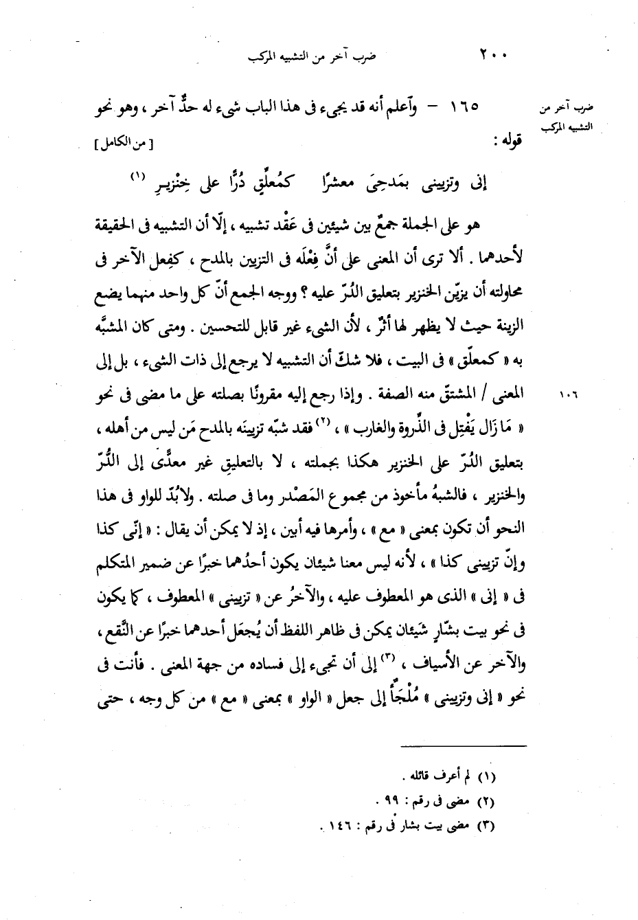 هو على الجملة جمعٌ بين شيئين في عَقْد تشبيه، إلاّ أن التشبيه في الحقيقة لأحدهما، ألا ترى أن المعنى على أنَّ فِعْلَهُ في التزيين بالمدح، كفِعل الآخر في محاولته أن يزّين الخنزير بتعليق الدُرّ عليه؟ ووجه الجمع أنّ كل واحد منهما يضع الزينة حيث لا يظهر لها أثرٌ، لأن الشيء غير قابل للتحسين، ومتى كان المشبَّه به كمعلّق في البيت، فلا شكّ أن التشبيه لا يرجع إلى ذات الشيء، بل المعنى المشتقّ منه الصفة، وإذا رجع إليه مقروناً بصلته على ما مضى في نحو مَا زَالَ يَفْتِل في الذِّروة والغارب، فقد شبّه تزيينَه بالمدح مَن ليس من أهله، بتعليق الدُّر على الخنزير هكذا بجملته، لا بالتعليق غير معدًّى إلى الدُّرّ والخنزير، فالشبهُ مأخوذ من مجموع المَصْدَر وما في صلته، ولا بُدّ للواو في هذا النحو أن تكون بمعنى مع، وأمرها فيه أبين، إذ لا يمكن أن يقال إنّي كذا وإنّ تزييني كذا، لأنه ليس معنا شيئان يكون أحدُهما خبراً عن ضمير المتكلم في إني الذي هو المعطوف عليه، والآخرُ عن تزييني المعطوف، كما يكون نحو بيت بشّارٍ شَيئان يمكن في ظاهر اللفظ أن يُجعل أحدهما خبراً عن النَّقع، والآخر عن الأسياف، إلى أن تجيء إلى فساده من جهة المعنى، فأنت في نحو إني وتزييني مُلْجَأٌ إلى جعل الواو بمعنى مع من كل وجه، حتى