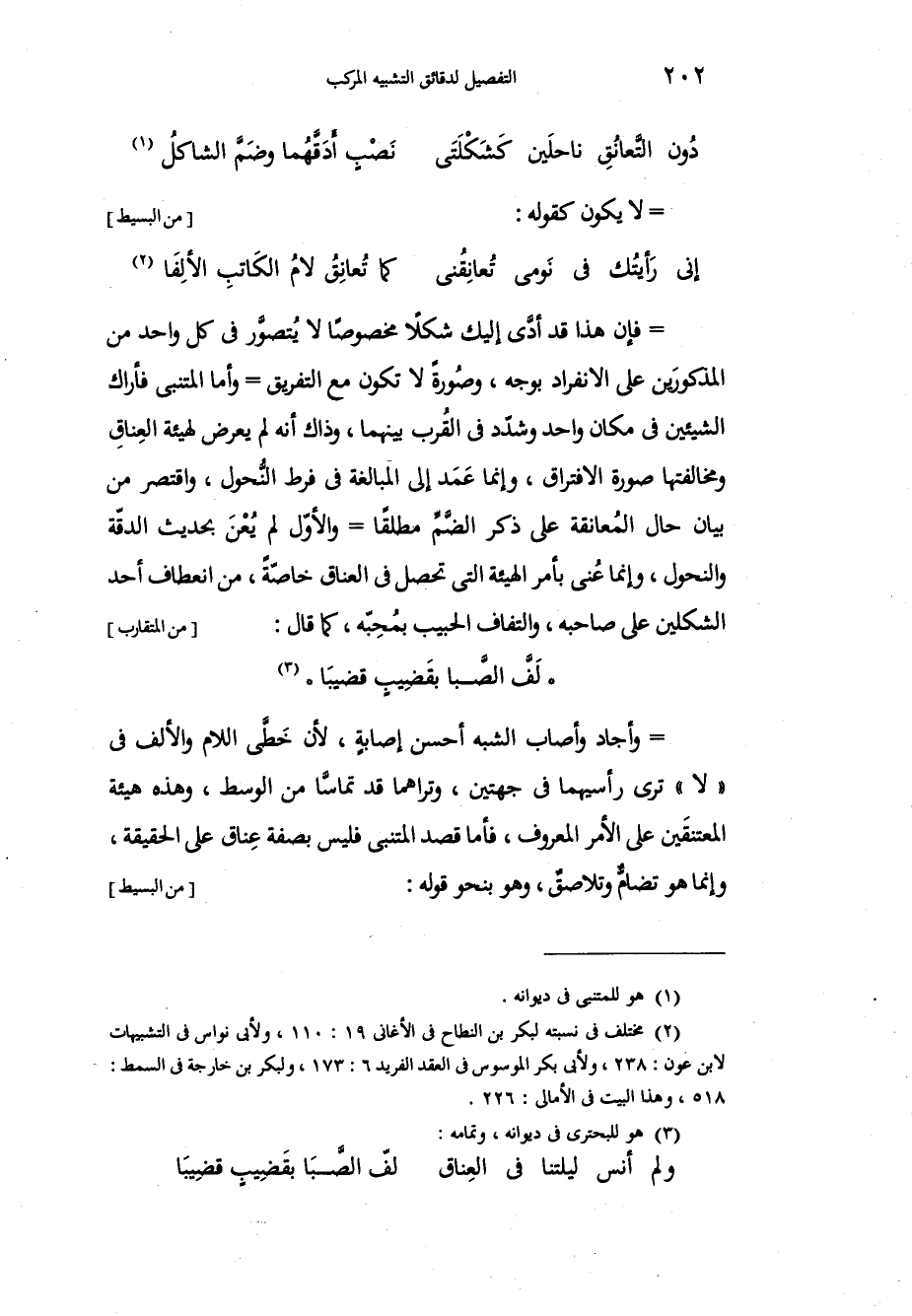 فإن هذا قد أدَّى إليك شكلاً مخصوصاً لا يُتصوَّر في كل واحد من المذكورين على الانفراد بوجه، وصُورةً لا تكون مع التفريق وأما المتنبي فأراك الشيئين في مكان واحد وشدّد في القُرب بينهما، وذاك أنه لم يعرض لهيئة العِناقِ ومخالفتها صورة الافتراق، وإنما عَمد إلى المبالغة في فرط النُّحول، واقتصر من بيان حال المُعانقة على ذكر الضَّمِّ مطلقاً والأوّل لم يُعْنَ بحديث الدقّة والنحول، وإنما عُني بأمر الهيئة التي تحصل في العناق خاصّةً، من انعطاف أحد الشكلين على صاحبه، والتفاف الحبيب بمُحِبّه، كما قال: