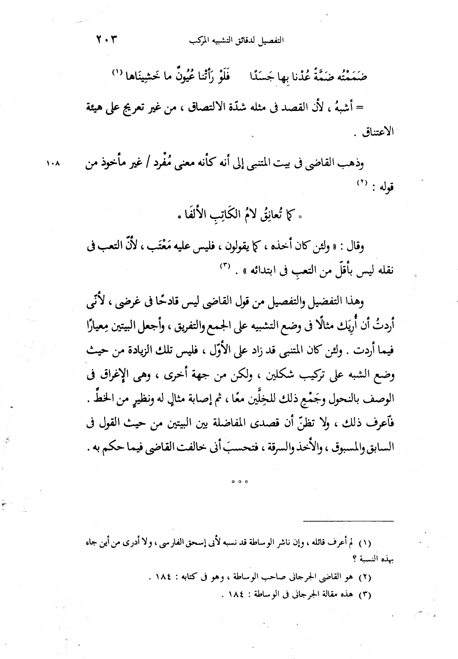 كما تُعانِقُ لامُ الكَاتِبِ الألفَا وقال: ولئن كان أخذه، كما يقولون، فليس عليه مَعْتَب، لأنّ التعب في نقله ليس بأقلّ من التعبِ في ابتدائه. وهذا التفضيل والتفصيل من قول القاضي ليس قادحاً في غرضي، لأنّي أردتُ أن أُرِيَك مثالاِ في وضع التشبيه على الجمع والتفريق، وأجعل البيتين مِعياراً فيما أردت، ولئن كان المتنبي قد زاد على الأوّل، فليس تلك الزيادة من حيث وضع الشبه على تركيب شكلين، ولكن من جهة أخرى، وهي الإغراق في الوصف بالنحول وجَمْعِ ذلك للخِلَّين معاً، ثم إصابة مثالٍ له ونظيرٍ من الخطِّ، فاعرف ذلك، ولا تظنّ أن قصدي المفاضلة بين البيتين من حيث القول في السابق والمسبوق، والأخذ والسرقة، فتحسبَ أني خالفت القاضي فيما حكم به.