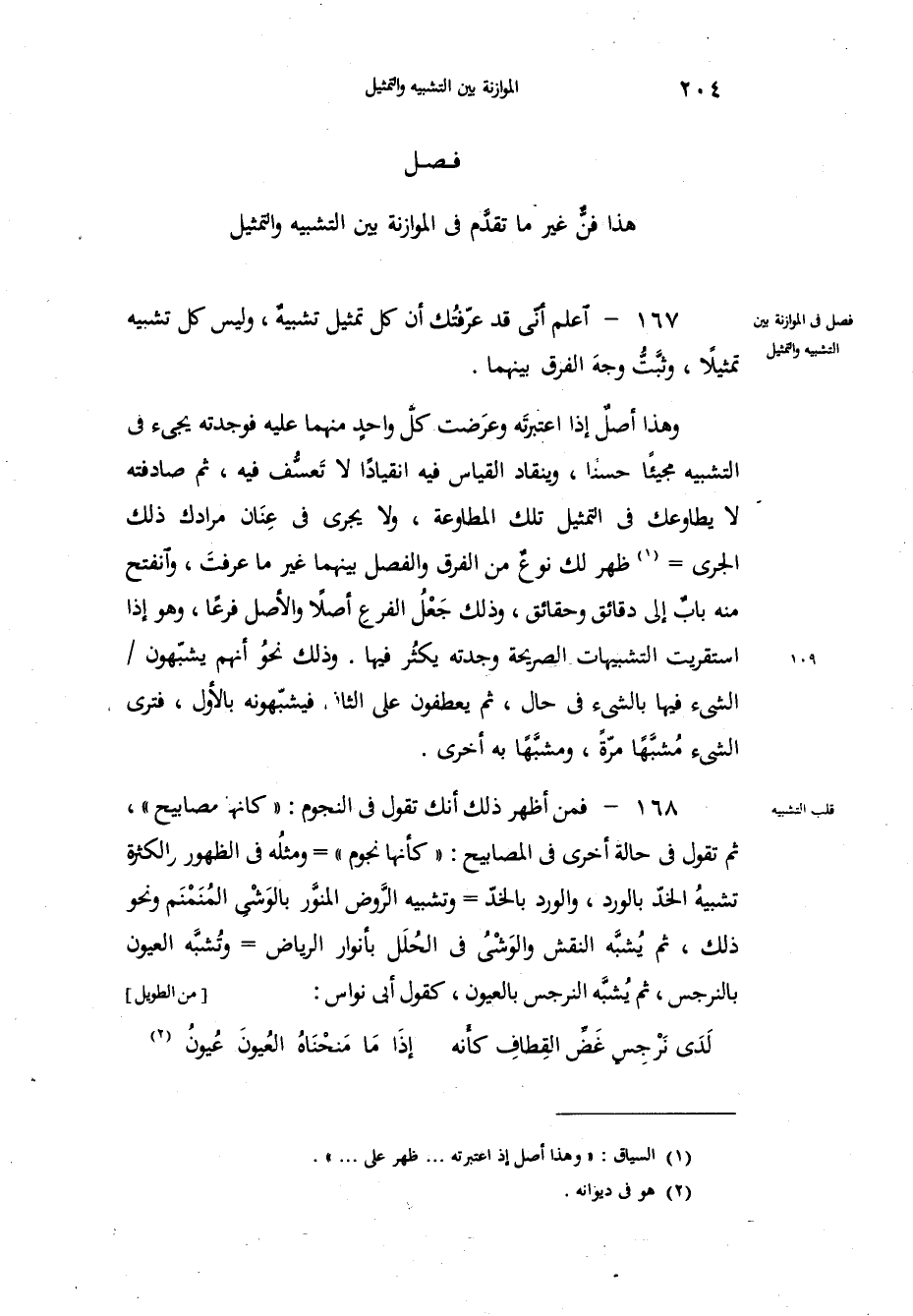 " هذا فنٌّ غير ما تقدَّم في الموازنة بين التشبيه والتمثيل ". اعلم أنّي قد عرّفتك أن كل تمثيل تشبيهٌ، وليس كل تشبيه تمثيلاً، وثبَّتُّ وجهَ الفرق بينهما، وهذا أصلٌ إذا اعتبرتَه وعرَضت كلَّ واحدٍ منهما عليه فوجدته يجيء في التشبيه مجيئاً حسناً، وينقاد القياس فيه انقياداً لا تَعسُّف فيه، ثم صادفته لا يطاوعك في التمثيل تلك المطاوعة، ولا يجري في عِنَان مرادك ذلك الجري ظهر لك نوعٌ من الفرق والفصل بينهما غير ما عرفتَ، وانفتح منه بابٌ إلى دقائق وحقائق، وذلك جَعْلُ الفرعِ أصلاً والأصل فرعاً، وهو إذا استقريت التشبيهات الصريحة وجدته يكثُر فيها، وذلك نحوُ أنهم يشبّهون الشيء فيها بالشيء في حال، ثم يعطفون على الثاني فيشبّهونه بالأول، فترى الشيء مُشبَّهَاً مرّةً، ومشبَّهاً به أخرى، فمن أظهر ذلك أنك تقول في النجوم كأنها مصابيح، ثم تقول في حالة الأخرى في المصابيح كأنها نجوم ومثلُه في الظهور والكثرة تشبيهُ الخدّ بالورد، والورد بالخدّ وتشبيه الرَّوض المنوَّر بالوَشْي المُنَمْنَم ونحو ذلك، ثم يُشبَّه النقش والوَشْيُ في الحُلَل بأنوار الرياض وتُشبَّه العيون بالنرجس، ثم يُشبَّه النرجس بالعيون، كقول أبي نواس: