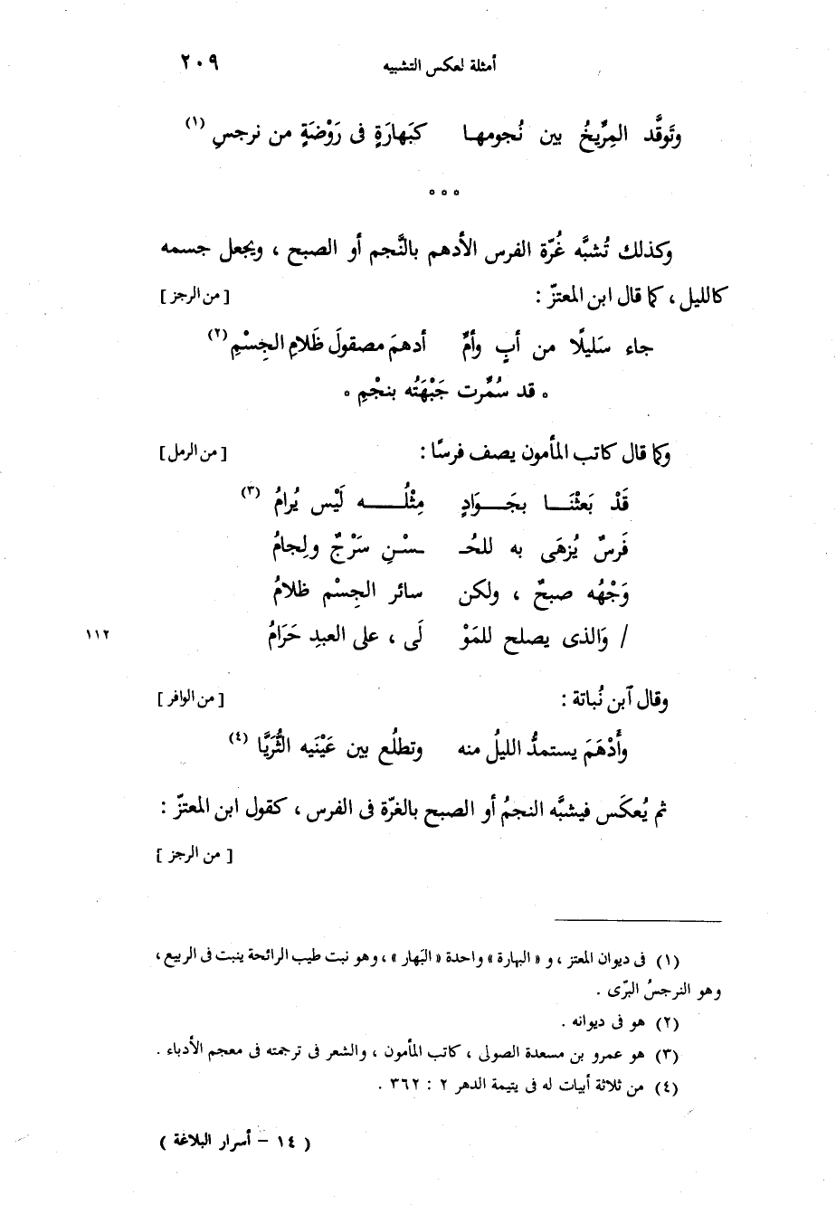 وكذلك تُشبَّه غُرّة الفرس الأدهم بالنَّجم أو الصبح، ويجعل جسمه كالليل، كما قال ابن المعتزّ: