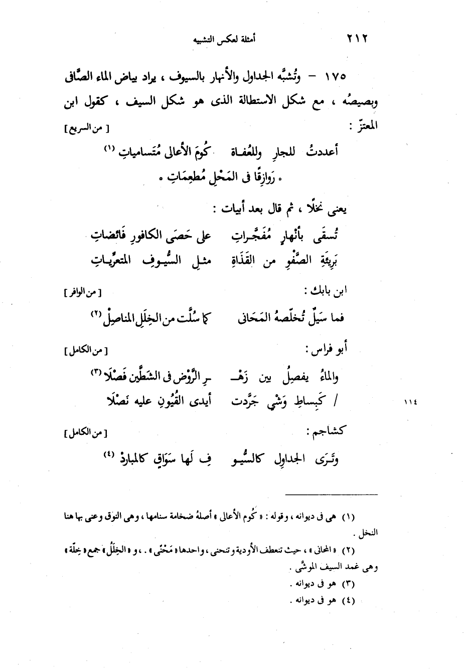 وتُشبَّه الجداول والأنهار بالسيوف، يراد بياض الماء الصَّافي وبصيصُه، مع شكل الاستطالة الذي هو شكل السيف، كقول ابن المعتز: