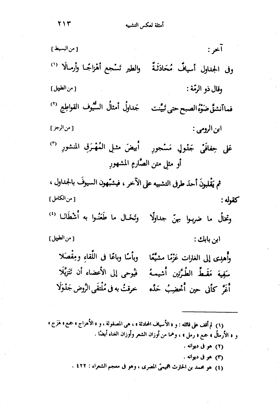 ثم يَقْلبونَ أحدَ طرفي التشبيه على الآخر، فيشبّهون السيوفَ بالجداول، كقوله:
