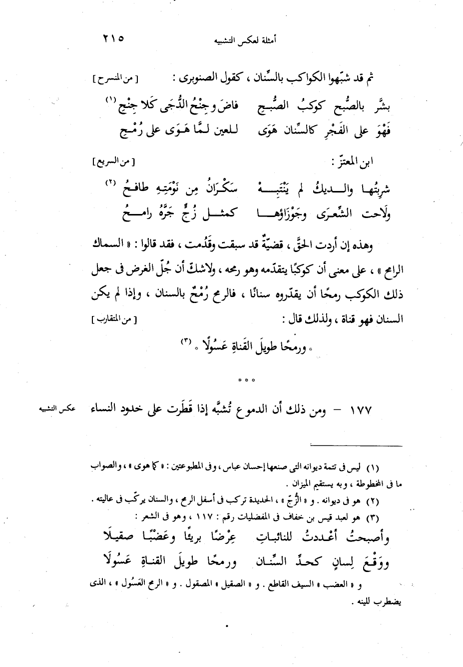ثم قد شبّهوا الكواكب بالسِّنان، كقول الصنوبري: