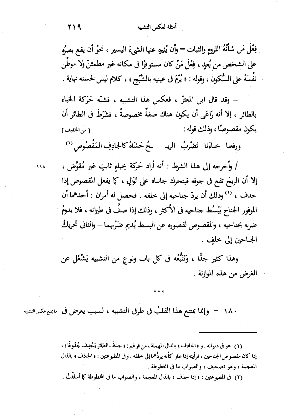 فِعْلَ مَن شأنُهُ اللزوم والثبات وأن يُثيره عنها الشيءَ اليسير، نحوُ أن يقع بصرُه على الشخص من بُعدٍ، فِعْلَ مَنْ كان مستوفِزاً في مكانه غير مطمئنّ ولا موطِّن نفْسَهُ على السُّكون، وقوله: يُرْمَ في عينيه بالشَّبْحِ، كلام ليس لحسنه نهاية. وقد قال ابن المعتزّ فعكس هذا التشبيه، فشبّه حَرَكة الخباء بالطائر، إلا أنه رَاعَى أن يكون هناك صفةٌ مخصوصةٌ، فشَرَطَ في الطائر أن يكون مقصوصاً، وذلك قوله: