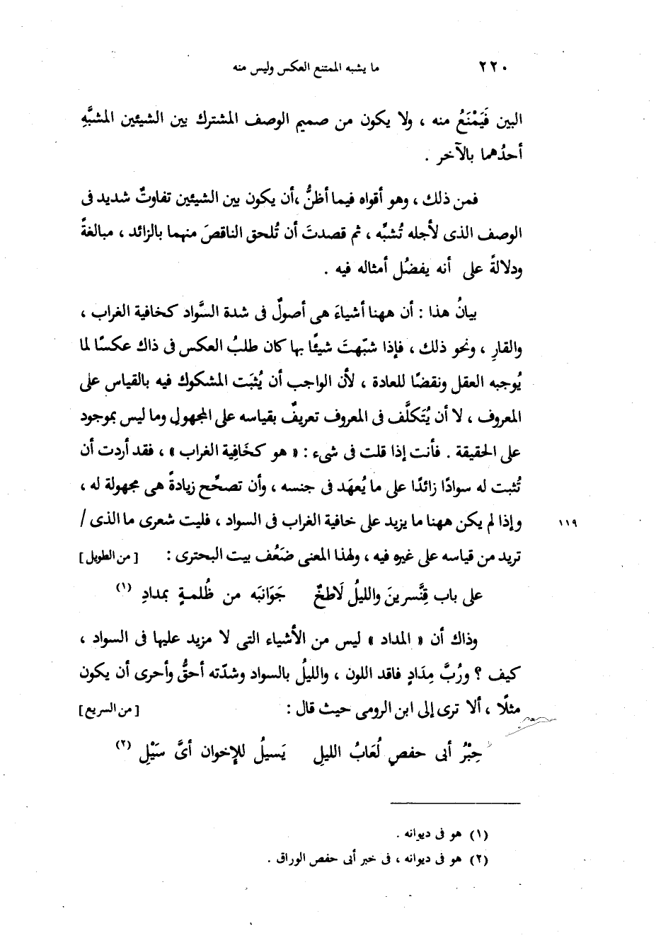 وذاك أن المداد ليس من الأشياء التي لا مزيد عليها في السواد، كيف ورُبَّ مِدَادٍ فاقد اللون، والليلُ بالسواد وشدّته أحقّ وأحرى أن يكون مثلاً، ألا ترى إلى ابن الرومي حيث قال السريع: