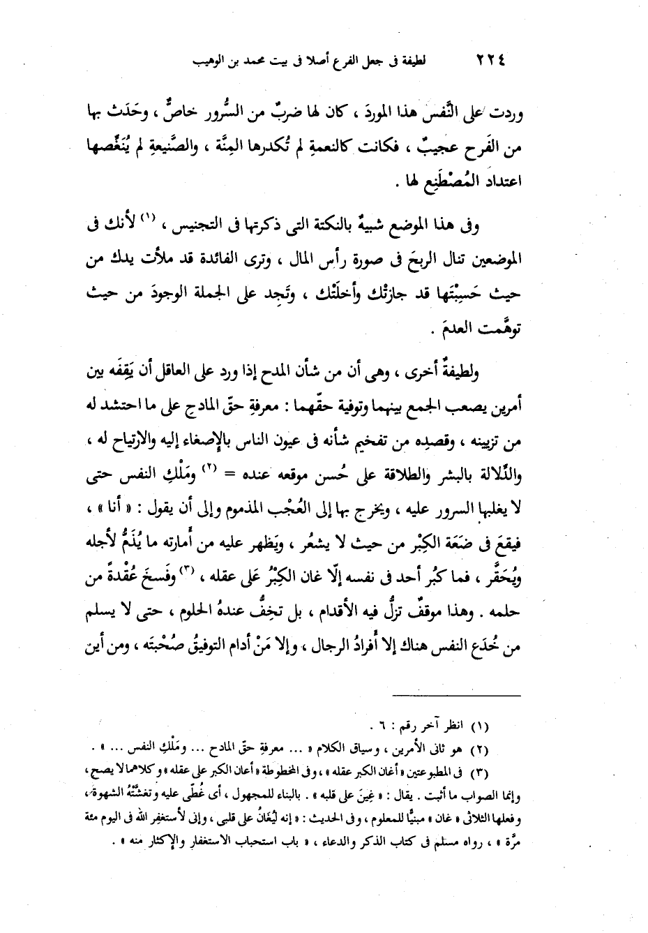 وردت على النَّفس هذا الموردَ، كان لها ضربٌ من السُّرور خاصٌّ وحَدَث بها من الفَرح عجيبٌ، فكانت كالنعمةِ لم تُكدرها المِنَّة، والصَّنيعةِ لم يُنَغِّصها اعتداد المُصْطَنِع لها، وفي هذا الموضع شبيهٌ بالنكتة التي ذكرتها في التجنيس، لأنك في الموضعين تنال الربحَ في صورة رأس المال، وترى الفائدة قد ملأت يدك من حيث حَسِبْتَها قد جازتْك وأخلَتْك، وتَجِد على الجملة الوجودَ من حيث توهمَّت العدمَ، ولطيفةٌ أخرى، وهو أن من شأن المدح إذا ورد على العاقل أن يَقِفَه بين أمرين يصعب الجمع بينهما وتوفية حقَّهما: معرفةِ حقّ المادحِ على ما احتشد له من تزيينه، وقصِده من تفخيم شأنه في عيون الناس بالإصغاء إليه والارتياح له، والدِّلالة بالبشر والطلاقة على حُسن موقعه عنده ومَلْكِ النفس حتى لا يغلبها السرور عليه، ويخرج بها إلى العُجْب المذموم وإلى أن يقول: أنا، فيقعَ في ضَعَة الكِبْر من حيث لا يشعُر، ويَظهر عليه من أَمارته ما يُذَمُّ لأجله ويُحَقَّر، فما كُبر أحد في نفسه إلاّ غان الكِبْرُ عَلى عقله، وفَسخَ عُقْدةً من حلمه، وهذا موقفٌ تزلُّ فيه الأقدام، بل تخِفَّ عندهُ الحلوم، حتى لا يسلم من خُدَع النفس هناك إلا أَفرادُ الرجال، وإلا مَنْ أدام التوفيقُ صُحْبتَه، ومن أين