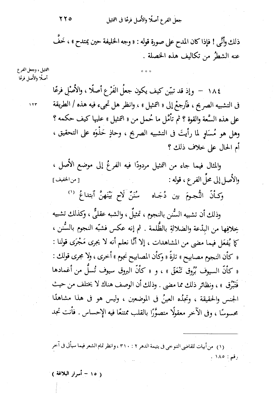 وذلك أن تشبيه السُّنن بالنجوم، تمثيلٌ، والشبه عقليٌّ، وكذلك تشبيه خِلافِها من البِدْعة والضلالةِ بالظُّلمة، ثم إنه عكس فشبّه النجم بالسُّنن، كما يُفعَل فيما مضى من المشاهدات، إلا أنَّا نعلم أنه لا يجري مَجْرَى قولنا كأن النجوم مصابيح تارةً وكأن المصابيح نجوم أخرى، ولا مجرى قولك: كأنّ السيوف بُروق تَنْعَقّ، وكأنّ البروق سيوف تُسلُّ من أغمادها فَتَبْرُق، ونظائر ذلك مما مضى، وذلك أن الوصف هناك لا يختلف من حيث الجنس والحقيقة، وتجدُه العينُ في الموضعين، وليس هو في هذا مشاهداً محسوساً، وفي الآخر معقولاً متصوَّراً بالقلب ممتنعاً فيه الإحساس، فأنت تجد
