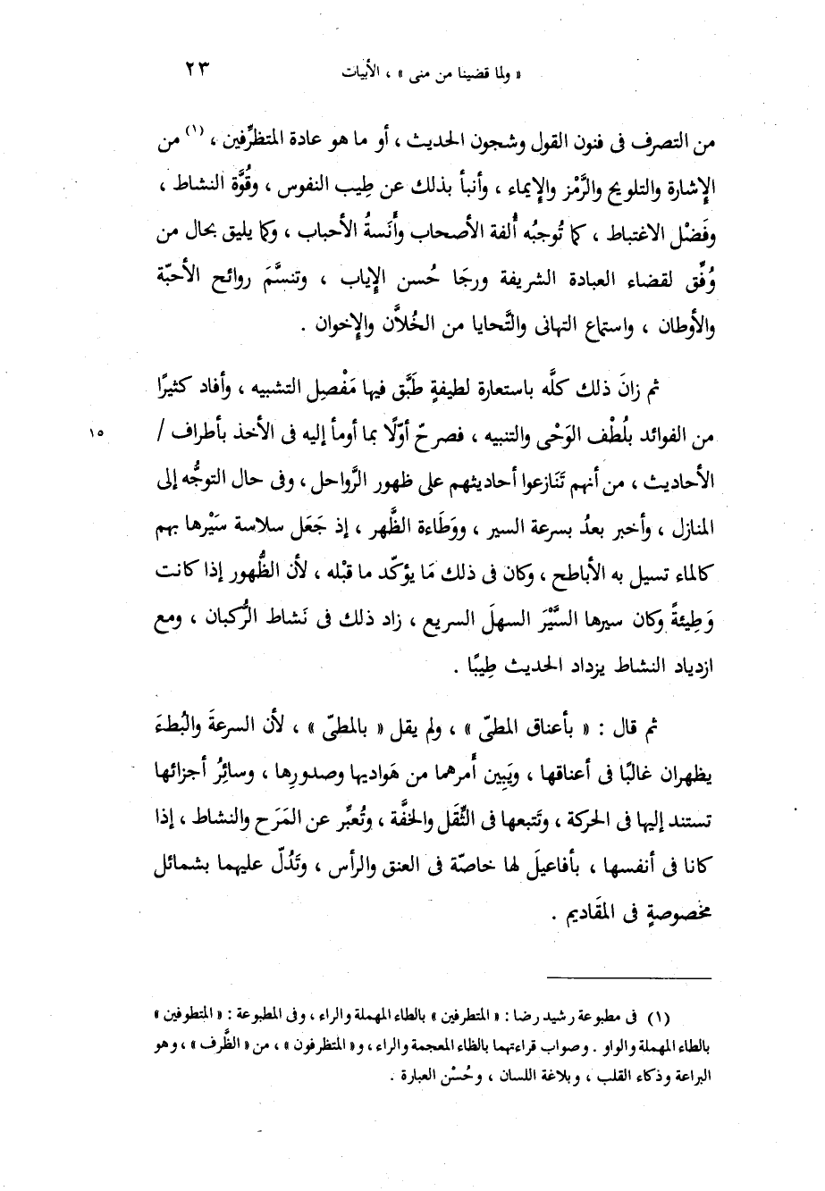 من التصرف في فنون القولِ وشجون الحديث، أو ما هو عادة المتظرِّفين، من الإشارة والتلويح والرَّمْز والإيماء، وأنبأ بذلك عن طِيب النفوس، وقُوَّة النشاط، وفَضْلِ الاغتباط، كما تُوجبُه ألفة الأصحاب وأُنسةُ الأحباب، وكما يليق بحال من وُفَّق لقضاء العبادة الشريفة ورجا حُسن الإياب، وتنسَّمَ روائح الأحبّة والأوطان، واستماع التهاني والتَّحايا من الخُلاَّن والإخوان، ثم زانَ ذلك كلَّه باستعارة لطيفةٍ طَبَّق فيها مَفْصِل التشبيه، وأفاد كثيراً من الفوائد بلُطْف الوَحْي والتنبيه، فصرحّ أوّلاً بما أومأ إليه في الأخذ بأطراف الأحاديث، من أنهم تَنَازعوا أحاديثهم على ظهور الرَّواحل، وفي حال التوجُّه إلى المنازل، وأخبر بعدُ بسرعة السير، ووَطَاءة الظَّهر، إذ جَعَل سلاسة سَيْرها بهم كالماء تسيل به الأباطح، وكان في ذلك ما يؤكّد ما قبْله، لأن الظُّهور إذا كانت وَطِيئةً وكان سيرها السَّيْرَ السهلَ السريع، زاد ذلك في نشاط الرُّكبان، ومع ازدياد النشاط يزداد الحديث طِيباً، ثم قال: بأعناق المطيّ، ولم يقل بالمطيّ، لأن السرعة والبُطءَ يظهران غالباًفي أعناقها، ويَبِين أمرهما من هَواديها وصدورِها، وسائِرُ أجزائها تستند إليها في الحركة، وتَتبعها في الثِّقَل والخفَّة، ويُعبِّر عن المَرَح والنشاط، إذا كانا في أنفسها، بأفاعيلَ لها خاصّة في العنق والرأس، وتَدُلّ عليهما بشمائل مخصوصةٍ في المقاديم،
