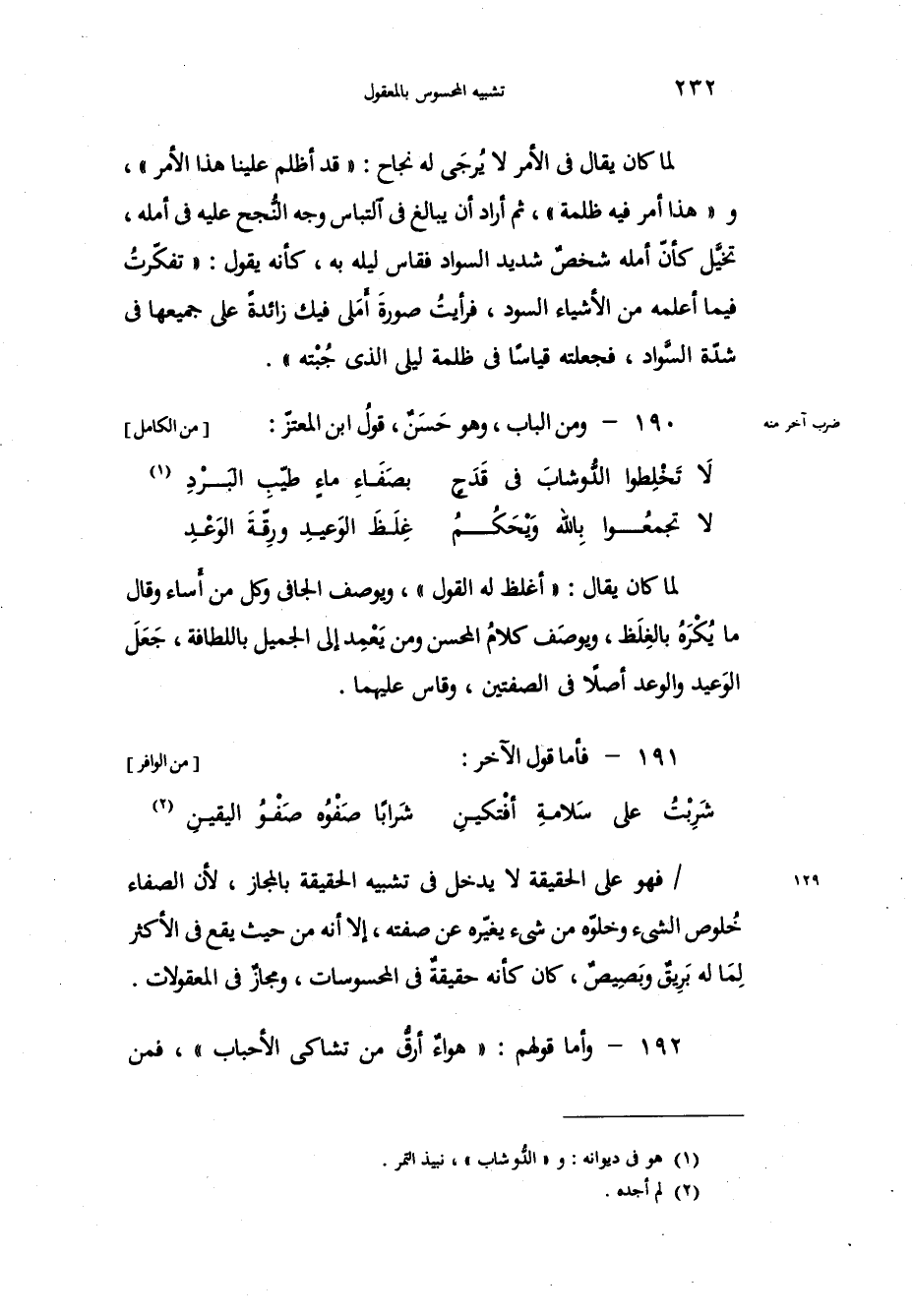 فهو على الحقيقة لا يدخل في تشبيه الحقيقة بالمجاز، لأن الصفاء خُلوص الشيء وخلوّه من شيء يغيّره عن صفته، إلا أنه من حيث يقع في الأكثر لِمَا له بَرِيقٌ وبَصِيصٌ، كان كأنه حقيقةٌ في المحسوسات، ومجازٌ في المعقولات. وأما قولهم هواءٌ أرقُّ من تشاكي الأحباب، فمن