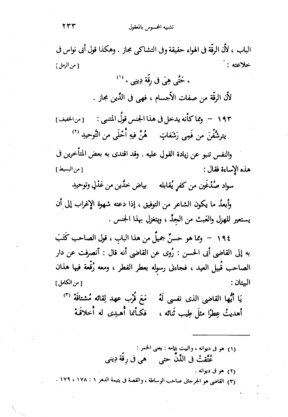 الباب، لأن الرقّة في الهواء حقيقة وفي التشاكي مجاز، وهكذا قول أبي نواس في خلاعته: " حَتَّى هِيَ في رِقّة دِينِي " لأن الرقَّة من صفات الأجسام، فهي في الدِّين مجاز: ومما كأنه يدخل في هذا الجنس قولُ المتنبي: