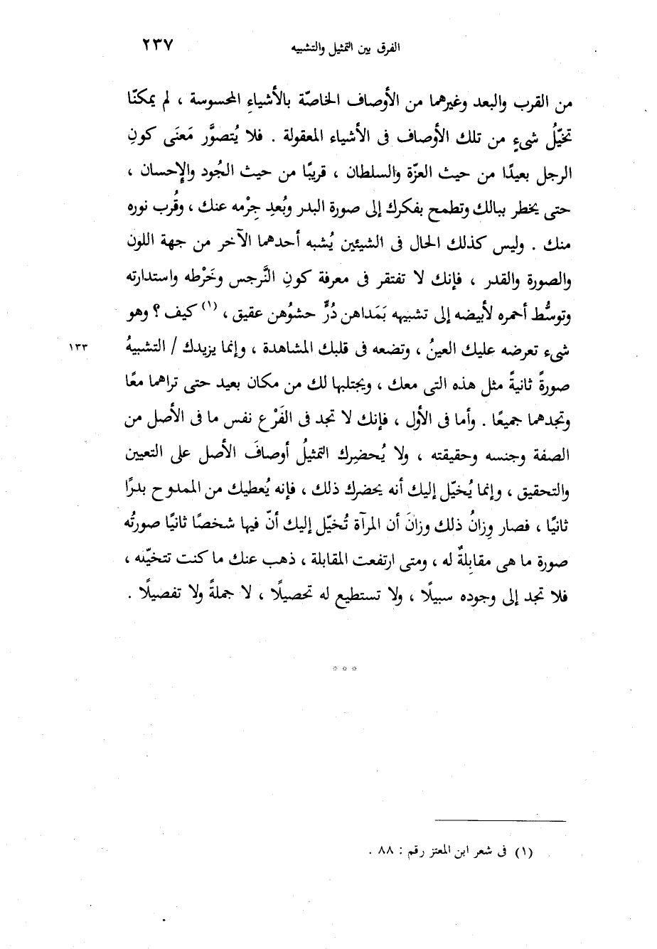 بالأشياءِ المحسوسة، لم يمكنّا تخيّلُ شيءٍ من تلك الأوصاف في الأشياء المعقولة، فلا يُتصوَّر مَعنَى كونِ الرجل بعيداً من حيث العزّة والسلطان، قريباً من حيث الجُود والإحسان، حتى يخطر ببالك وتطمح بفكرك إلى صورة البدر وبُعد جِرْمه عنك، وقُرب نوره منك، وليس كذلك الحال في الشيئين يُشبه أحدهما الآخر من جهة اللون والصورة والقدر، فإنك لا تفتقر في معرفة كونِ النَّرجس وخَرْطه واستدارته وتوسُّط أحمره لأبيضه إلى تشبيهه بمَدَاهن عقيق، كيف وهو شيء تعرضه عليك العينُ، وتضعه في قلبك المشاهدة، وإنما يزيدك التشبيهُ صورةً ثانيةً مثل هذه التي معك، ويجتلبها لك من مكان بعيد حتى تراهما معاً وتجدهما جميعاً، وأما في الأول، فإنك لا تجد في الفَرْع نفس ما في الأصل من الصفة وجنسه وحقيقته، ولا يُحضِرك التمثيلُ أوصافَ الأصل على التعيين والتحقيق، وإنما يُخيّل إليك أنه يحضرك ذلك، فإنه يُعطيك من الممدوح بدراً ثانياً، فصار وِزانُ ذلك وزانَ أن المرآة تُخيّل إليك أنّ فيها شخصاً ثانياً صورتُه صورة ما هي مقابِلةٌ له، ومتى ارتفعت المقابلة، ذهب عنك ما كنت تتخيّله، فلا تجد إلى وجوده سبيلاً، ولا تستطيع له تحصيلاً، لا جملةً ولا تفصيلاً. اءِ المحسوسة، لم يمكنّا تخيّلُ شيءٍ من تلك الأوصاف في الأشياء المعقولة، فلا يُتصوَّر مَعنَى كونِ الرجل بعيداً من حيث العزّة والسلطان، قريباً من حيث الجُود والإحسان، حتى يخطر ببالك وتطمح بفكرك إلى صورة البدر وبُعد جِرْمه عنك، وقُرب نوره منك، وليس كذلك الحال في الشيئين يُشبه أحدهما الآخر من جهة اللون والصورة والقدر، فإنك لا تفتقر في معرفة كونِ النَّرجس وخَرْطه واستدارته وتوسُّط أحمره لأبيضه إلى تشبيهه بمَدَاهن عقيق، كيف وهو شيء تعرضه عليك العينُ، وتضعه في قلبك المشاهدة، وإنما يزيدك التشبيهُ صورةً ثانيةً مثل هذه التي معك، ويجتلبها لك من مكان بعيد حتى تراهما معاً وتجدهما جميعاً، وأما في الأول، فإنك لا تجد في الفَرْع نفس ما في الأصل من الصفة وجنسه وحقيقته، ولا يُحضِرك التمثيلُ أوصافَ الأصل على التعيين والتحقيق، وإنما يُخيّل إليك أنه يحضرك ذلك، فإنه يُعطيك من الممدوح بدراً ثانياً، فصار وِزانُ ذلك وزانَ أن المرآة تُخيّل إليك أنّ فيها شخصاً ثانياً صورتُه صورة ما هي مقابِلةٌ له، ومتى ارتفعت المقابلة، ذهب عنك ما كنت تتخيّله، فلا تجد إلى وجوده سبيلاً، ولا تستطيع له تحصيلاً، لا جملةً ولا تفصيلاً.