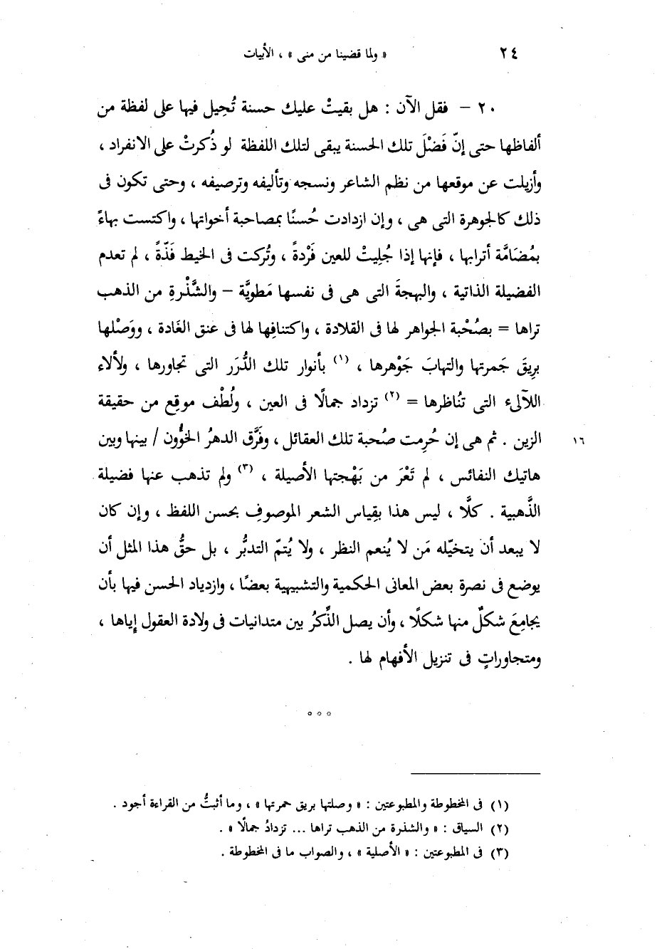 فقل الآن: هل بقيتْ عليك حسنة تُحِيل فيها على لفظة من ألفاظها حتى إنّ فَضْلَ تلك الحسنة يبقى لتلك اللفظة لو ذُكرتْ على الانفراد، وأزيلت عن موقعها من نظم الشاعر ونسجه وتأليفه وترصيفه، وحتى تكون في ذلك كالجوهرة التي هي، وإن ازدادت حُسناً بمصاحبة أخواتها، واكتست بهاءً بمُضَامَّة أترابها، فإنها إذا جُلِيتْ للعين فَرْدةً، وتُركت في الخيط فَذَّة، لم تعدم الفضيلة الذاتية، والبهجة التي في نفسها مَطويَّة والشَّذْرةِ من الذهب تراها بصُحْبة الجواهر لها في القلادة، واكتنافها لها في عنق الغَادة، ووَصْلها بريقَ جَمرتها والتهاب جَوْهَرها، بأنوار تلك الدُّرَر التي تجاورها، ولألاء اللآلئ التي تُناظرها تزداد جمالاً في العين، ولُطْف موقِع من حقيقة الزين، ثم هي إن حُرِمت صُحبة تلك العقائل، وفَرَّقَ الدهرُ الخؤُون بينها وبين هاتيك النفائس، لم تَعْرَ من بَهْجتها الأصيلة، ولم تذهب عنها فضيلة الذَّهبية، كلاَّ، ليس هذا بِقياس الشعر الموصوفِ بحسن اللفظ، وإن كان لا يبعد أن يتخيّله مَنْ لا يُنعم النظر، ولا يُتمّ التدبُّر، بل حقُّ هذا المثل أن يوضع في نصرة بعض المعاني الحكمية والتشبيهية بعضاً، وازدياد الحسن منها بأن يجامِعَ شكلٌ منها شكلاً، وأن يصل الذِّكرُ بين متدانيات في ولادة العقول إياها، ومتجاوراتٍ في تنزيل الأفهام لها.