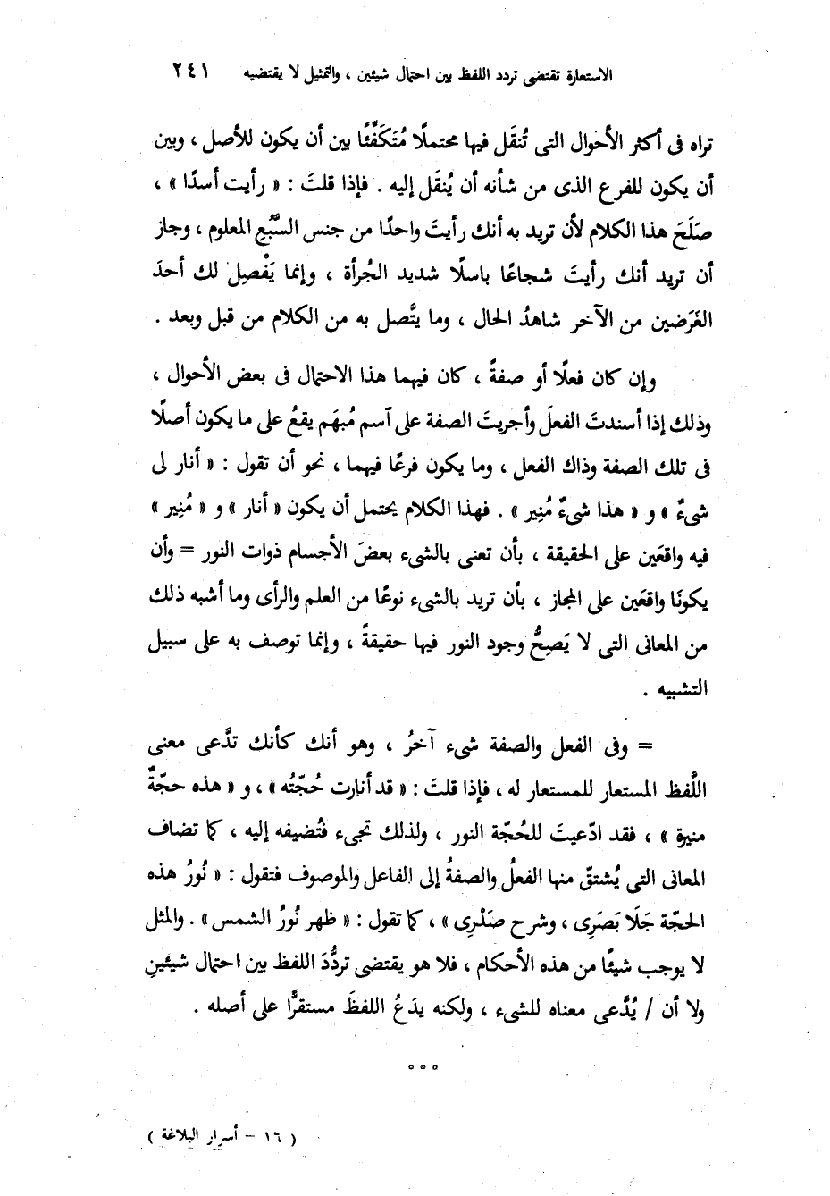 تراه في أكثر الأحوال التي تُنقَل فيها محتملاً مُتَكَفِّئاً بين أن يكون للأصل، وبين أن يكون للفرع الذي من شأنه أن يُنقَل إليه، فإذا قلتَ: رأيت أسداً، صَلَحَ هذا الكلام لأن تريد به أنك رأيتَ واحداً من جنس السَّبُعِ المعلوم، وجاز أن تريد أنك رأيتَ شجاعاً باسلاً شديد الجُرأة، وإنما يَفْصِل لك أحدَ الغَرَضين من الآخر شاهدُ الحال، وما يتَّصل به من الكلام من قبل وبعد. وإن كان فعلاً أو صفةً، كان فيهما هذا الاحتمال في بعض الأحوال، وذلك إذا أسندتَ الفعلَ وأجريتَ الصفة على اسم مُبهَم يقعُ على ما يكون أصلاً في تلك الصفة وذاك الفعل، وما يكون فرعاً فيهما، نحو أن تقول: أنار لي شيءٌ وهذا شيءٌ مُنِير، فهذا الكلام يحتمل أن يكون أنار ومُنِير فيه واقعَين على الحقيقة، بأن تعني بالشيء بعضَ الأجسام ذوات النور وأن يكونَا واقعَين على المجاز، بأن تريد بالشيء نوعاً من العلم والرأي وما أشبه ذلك من المعاني التي لا يَصِحُّ وجود النور فيها حقيقةً، وإنما توصف به على سبيل التشبيه. وفي الفعل والصفة شيء آخرُ، وهو أنك كأنك تدَّعي معنى اللَّفظ المستعار للمستعار له، فإذا قلتَ: قد أنارت حُجَّتُه، وهذه حجَّةٌ منيرة، فقد ادّعيتَ للحُجَّة النور، ولذلك تجيء فتُضيفه إليك، كما تضاف المعاني التي يُشتقّ منها الفعلُ والصفةُ إلى الفاعل والموصوف فتقول: نُورُ هذه الحجّة جَلاَ بَصَرِي، وشرح صَدْرِي، كما تقول: ظهر نُورُ الشمس، والمثل لا يوجب شيئاً من هذه الأحكام، فلا هو يقتضي تردُّدَ اللفظ بين احتمال شيئينِ ولا أن يُدَّعى معناه للشيء، ولكنه يدَعُ اللفظَ مستقرّاً على أصله. وإذ قد ثبت هذا الأصل، فاعلم أن هاهنا أصلاً آخر يُبنَى عليه، وهو أن الاستعارة وإن كانت تعتمد التشبيه والتمثيلَ وكان التشبيهُ يقتضي شيئين مشبَّهاً ومشبَّهاً به، وكذلك التمثيل، لأنه كما عرفت تشبيهٌ إلا أنه عقليٌّ فإن الاستعارة من شأنها أن تُسقِطَ ذكرَ المشبَّه من البَيْنِ وتطرحه، وتدَّعَي له الاسمَ الموضوعَ للمشبَّه به، كما مضى من قولك: رأيت أسداً، تريد رجلاً شجاعاً ووردتُ بحراً زاخراً، تريد رجلاً كثير الجُود فائضَ الكفّ وأبديتُ نوراً، تريد علماً وما شاكل ذلك، فاسم الَّذِي هو المشبَّه غير مذكورٍ بوجه من الوجوه كما ترى، وقد نقلتَ الحديثَ إلى اسم المشبَّه به، لقَصْدك أن تبالغ، فتضع اللَّفظ بحيث يُخيّل أنَّ معك نَفْس الأسد والبحر والنور، كي تُقوِّي أمر المشابهة وتشدّده، ويكون لها هذا الصنيع حيث يقع الاسم المستعار فاعلاً أو مفعولاً أو مجروراً بحرف الجرّ أو مضافاً إليه، فالفاعل كقولك: بدا لي أسدٌ وانبرى لي لَيْثٌ وبدا نُورٌ وظهرت شمسٌ ساطعة وفاض لي بالمواهبِ بحرٌ، كقوله: َ جنسٍ فإنك تراه في أكثر الأحوال التي تُنقَل فيها محتملاً مُتَكَفِّئاً بين أن يكون للأصل، وبين أن يكون للفرع الذي من شأنه أن يُنقَل إليه، فإذا قلتَ: رأيت أسداً، صَلَحَ هذا الكلام لأن تريد به أنك رأيتَ واحداً من جنس السَّبُعِ المعلوم، وجاز أن تريد أنك رأيتَ شجاعاً باسلاً شديد الجُرأة، وإنما يَفْصِل لك أحدَ الغَرَضين من الآخر شاهدُ الحال، وما يتَّصل به من الكلام من قبل وبعد. وإن كان فعلاً أو صفةً، كان فيهما هذا الاحتمال في بعض الأحوال، وذلك إذا أسندتَ الفعلَ وأجريتَ الصفة على اسم مُبهَم يقعُ على ما يكون أصلاً في تلك الصفة وذاك الفعل، وما يكون فرعاً فيهما، نحو أن تقول: أنار لي شيءٌ وهذا شيءٌ مُنِير، فهذا الكلام يحتمل أن يكون أنار ومُنِير فيه واقعَين على الحقيقة، بأن تعني بالشيء بعضَ الأجسام ذوات النور وأن يكونَا واقعَين على المجاز، بأن تريد بالشيء نوعاً من العلم والرأي وما أشبه ذلك من المعاني التي لا يَصِحُّ وجود النور فيها حقيقةً، وإنما توصف به على سبيل التشبيه. وفي الفعل والصفة شيء آخرُ، وهو أنك كأنك تدَّعي معنى اللَّفظ المستعار للمستعار له، فإذا قلتَ: قد أنارت حُجَّتُه، وهذه حجَّةٌ منيرة، فقد ادّعيتَ للحُجَّة النور، ولذلك تجيء فتُضيفه إليك، كما تضاف المعاني التي يُ