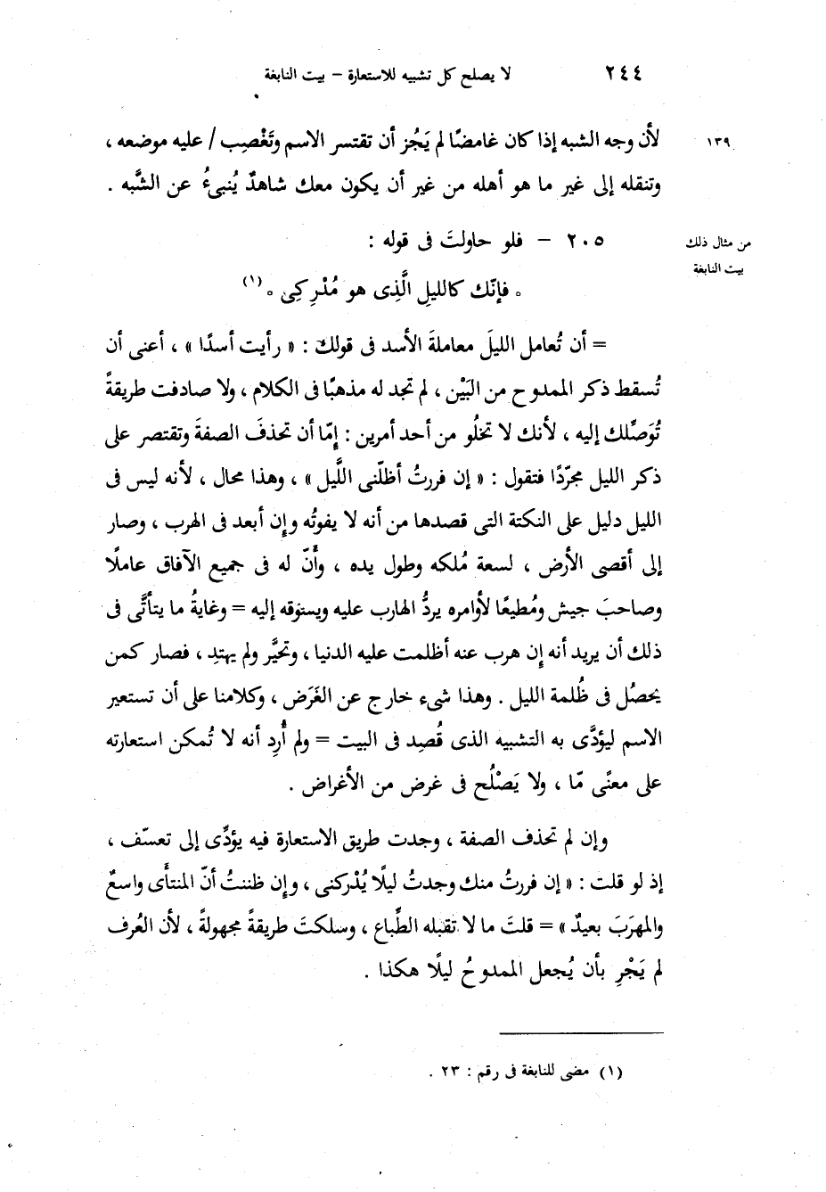 لأن وجه الشبه إذا كان غامضاً لم يَجُز أن تقتسر الاسم وتَغْصِب عليه موضعه، وتنقله إلى غير ما هو أهله من غير أن يكون معك شاهدٌ يُنبئُ عن الشَبه. فلو حاولتَ في قوله: " فإنَّك كالليلِ الَّذِي هو مُدْرِكِي " أن تُعامل الليلَ معاملةَ الأسد في قولك: رأيت أسداً، أعني أن تُسقط ذكر الممدوح من البَيْن، لم تجد له مذهباً في الكلام، ولا صادفت طريقةً تُوَصِّلك إليه، لأنك لا تخلُو من أحد أمرين إمّا أن تحذفَ الصفةَ وتقتصر على ذكر الليل مجرّداً فتقول إن فررتُ أظلّني اللَّيل، وهذا محال، لأنه ليس في الليل دليل على النكتة التي قصدها من أنه لا يفوتُه وإن أبعد في الهرب، وصار إلى أقصى الأرض، لسعة مُلكه وطول يده، وأَنّ له في جميع الآفاق عاملاً وصاحبَ جيش ومُطيعاً لأوامره يردُّ الهارب عليه ويسوقه إليه وغايةُ ما يتأتَّى في ذلك أن يريد أنه إن هرب عنه أظلمت عليه الدنيا، وتحيَّر ولم يهتدِ، فصار كمن يحصُل في ظُلمة الليل، وهذا شيء خارج عن الغَرَض، وكلامنا على أن تستعير الاسم ليؤدَّى به التشبيه الذي قُصِد في البيت ولم أُرِد أنه لا تُمكن استعارته على معنًى ما، ولا يَصْلُح في غرض من الأغراض. وإن لم تحذف الصفة، وجدت طريق الاستعارة فيه يؤدِّي إلى تعسّف، إذ لو قلت إن فررتُ منك وجدتُ ليلاً يُدْركني، وإن ظننتُ أنّ المنتأَى واسعٌ والمهرَبَ بعيدٌ قلتَ ما لا تقبله الطِّباع، وسلكتَ طريقةً مجهولةً، لأن العُرف لم يَجْرِ بأن يُجعل الممدوحُ ليلاً هكذا،