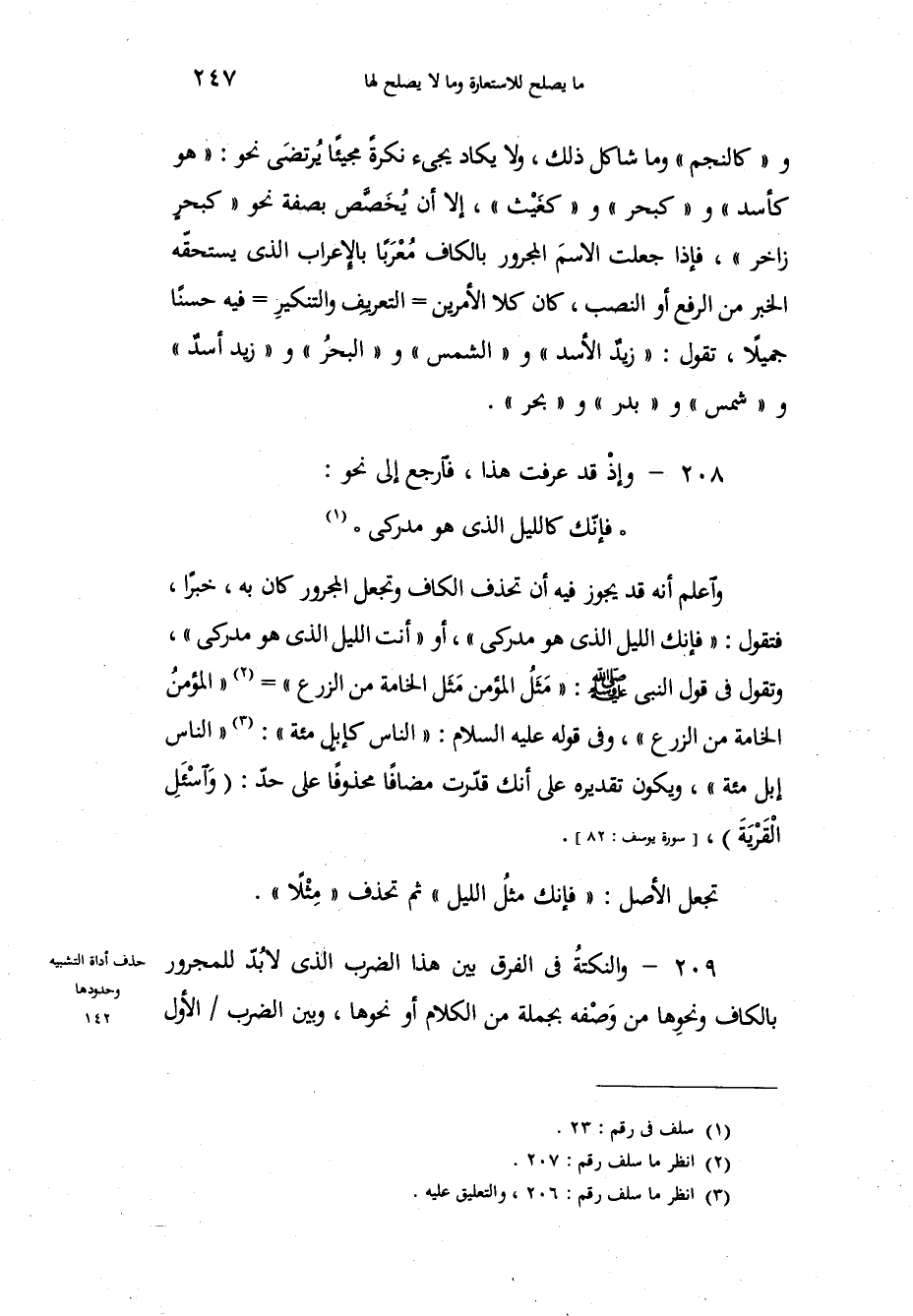 واعلم أنه قد يجوز فيه أن تحذف الكاف وتجعل المجرور كان به، خبراً، فتقول: فإنك الليل الذي هو مدركي، أو أنت الليل الذي هو مدركي، وتقول في قول النبي صلى الله عليه وسلم: " مَثَلُ المؤمن مَثَل الخامة من الزرع "، المؤمن الخامة من الزرع، وفي قوله عليه السلام: الناس كإبلٍ مئة (3) : الناس إبل مئة، ويكون تقديره على أنك قدّرت مضافاً محذوفاً على حدّ: " وَاسْئَلِ الْقَرْيَةَ " " يوسف: 82 "، تجعل الأصل: فإنك مثلُ الليل ثم تحذف مِثْلاً، والنكتةُ في الفرق بين هذا الضرب الذي لا بُدّ للمجرور بالكاف ونحوِها من وَصْفه بجملة من الكلام أو نحوها، وبين الضرب الأول