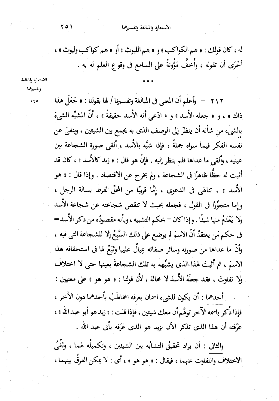 له، كان قولك: هم الكواكب وهم الليوث أو هم كواكب وليوث، أحْرَى أن تقوله، وأَخفَّ مَؤُونةً على السامع في وقوعِ العلم له به. واعلم أن المعنى في المبالغة وتفسيرنا لها بقولنا جَعَلَ هذا ذاك، وجعله الأسد وادّعى أنه الأسد حقيقةً، أنّ المشبِّه الشيءَ بالشيء من شأنه أن ينظرَ إلى الوصف الذي به يجمع بين الشيئين، وينفيَ عن نفسه الفكرفيما سواه جملةً، فإذا شبَّه بالأسد، ألقى صورة الشجاعة بين عينيه، ألقى ما عداها فلم ينظر إليه، فإنْ هو قال زيد كالأسد، كان قد أثبت له حظّاً ظاهراً في الشجاعة، ولم يخرج عن الاقتصاد، وإذا قال هو الأسد، تناهَى في الدعوى، إمّا قريباً من المحقِّ لفرط بسالة الرجل، وإما متجوِّزاً في القول، فجعله بحيث لا تنقص شجاعته عن شجاعة الأسد ولا يَعْدَمُ منها شيئاً، وإذا كان بحكم التشبيه، وبأنه مقصودُه من ذكر الأسد في حكم مَن يعتقدُ أنّ الاسمَ لم يوضع على ذلك السَّبعُ إلا للشجاعة التي فيه، وأنّ ما عداها من صورته وسائر صفاته عِيالٌ عليها وتَبَعٌ لها في استحقاقه هذا الاسمَ، ثم أثبتَ لهذا الذي يشبِّهه به تلك الشجاعةَ بعينها حتى لا اختلافَ ولا تفاوتَ، فقد جعلَهُ الأسدَ لا محالة، لأن قولنا هو هو على معنيين أحدهما أن يكون للشيء اسمان يعرفه المخاطَبُ بأحدهما دون الآخر، فإذا ذُكر باسمه الآخر توهَّم أن معك شيئين، فإذا قلت: زيد هو أبو عبد اللَه، عرّفته أن هذا الذي تذكر الآن بزيد هو الذي عَرَفه بأبي عبد اللَّه