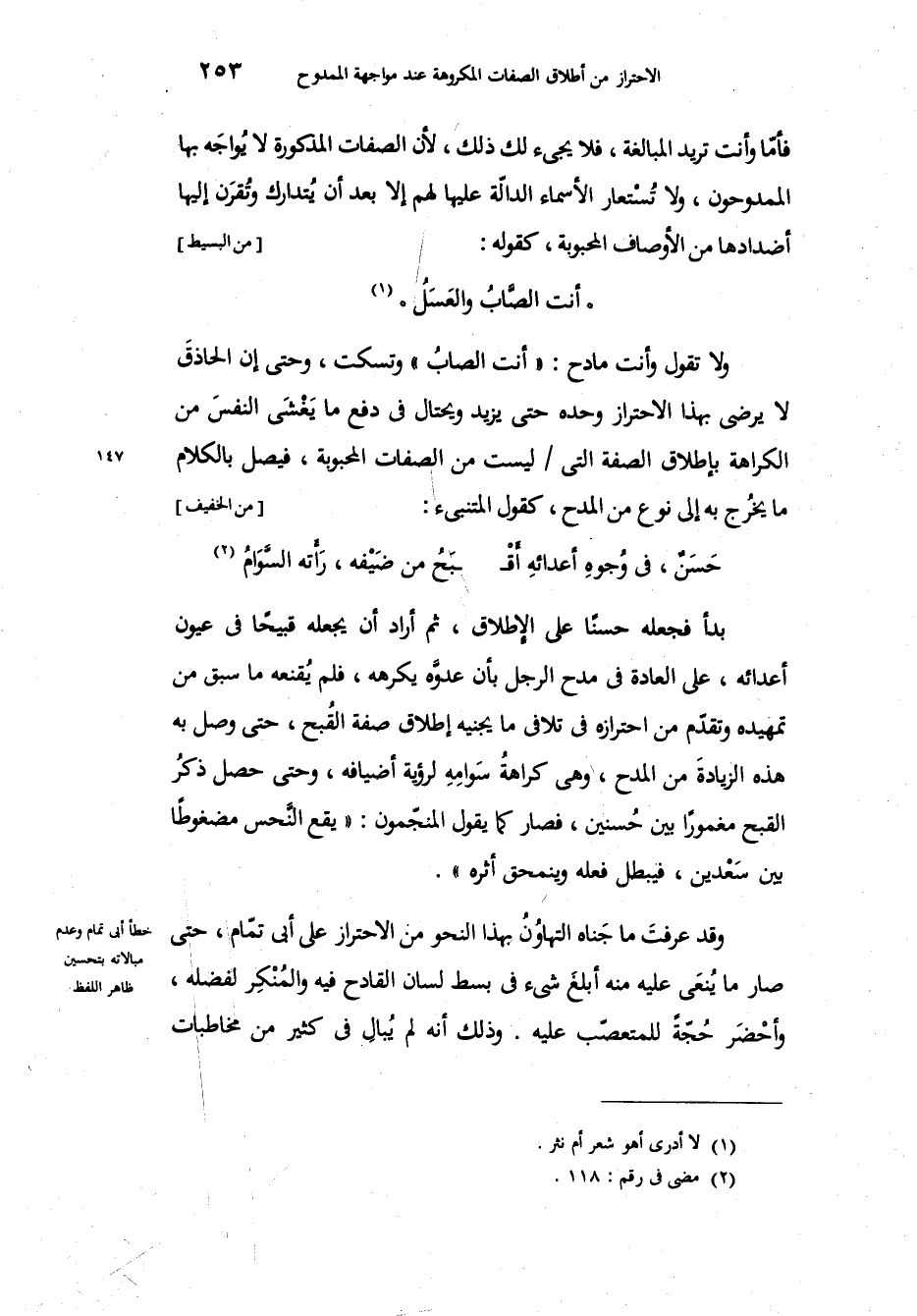 بدأ فجعله حسناً على الإطلاق، ثم أراد أن يجعله قبيحاً في عيون أعدائه، على العادة في مدح الرجل بأن عدوَّه يكرهه، فلم يُقنعه ما سبق من تمهيده وتقدّم من احترازه في تلاقي ما يجنيه إطلاق صفة القُبح، حتى وصل به هذه الزيادةَ من المدح، وهي كراهةُ سَوامِهِ لرؤية أضيافه، وحتى حصل ذكرُ القبح مغموراً بين حُسنين، فصار كما يقول المنجّمون: يقع النَّحس مضغوطاً بين سَعْدين، فيبطل فعله وينمحق أثره. وقد عرفتَ ما جَناه التهاوُنُ بهذا النحو من الاحتراز على أبي تمّام، حتى صار ما يُنعَى عليه منه أبلغ شيء في بسط لسان القادح فيه والمُنْكِر لفضله، وأحْضَر حُجّةً للمتعصّب عليه، وذلك أنه لم يُبالِ في كثير من مخاطبات