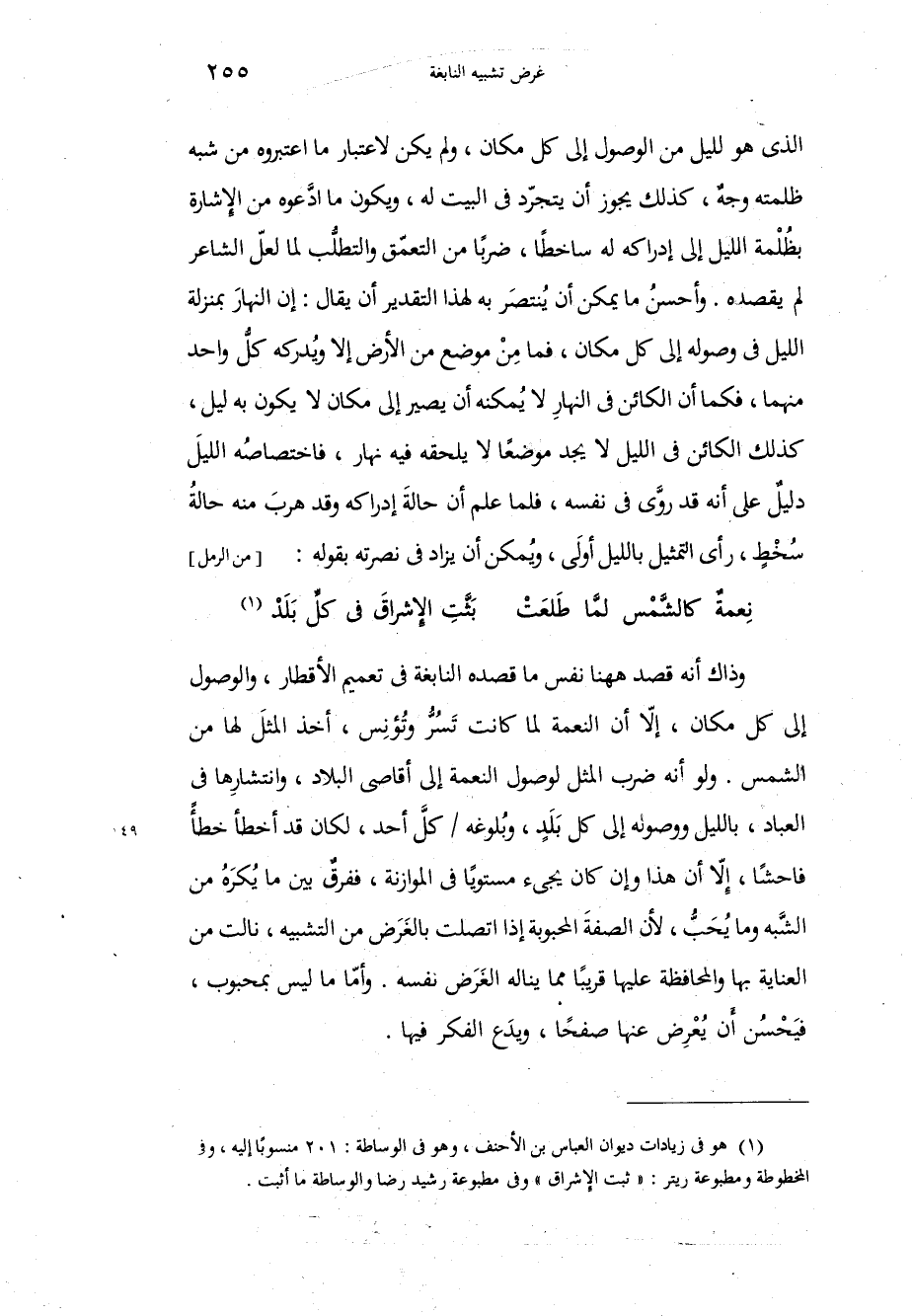 وذاك أنه قصد هاهنا نفس ما قصده النابغة في تعميم الأقطار، والوصول إلى كل مكان، إلاّ أن النعمة لما كانت تَسُرُّ وتُؤنِس، أخذ المثلَ لها من الشمس، ولو أنه ضرب المثل لوصول النعمة إلى أقاصي البلاد، وانتشارِها في العباد، بالليل ووصوله إلى كل بَلَدٍ، وبُلوغه كلَّ أحد، لكان قد أخطأ خطأً فاحشاً، إلاّ أن هذا وإن كان يجيء مستوياً في الموازنة، ففرقٌ بين ما يُكرَهُ من الشَّبه وما يُحَبُّ، لأن الصفةَ المحبوبة إذا اتصلت بالغَرَض من التشبيه، نالت من العناية بها المحافظة عليها قريباً مما يناله الغَرَض نفسه، وأّما ما ليس بمحبوب، فَيَحْسُن أَن يعْرض عنها صفحاً، ويدَع الفكر فيها،