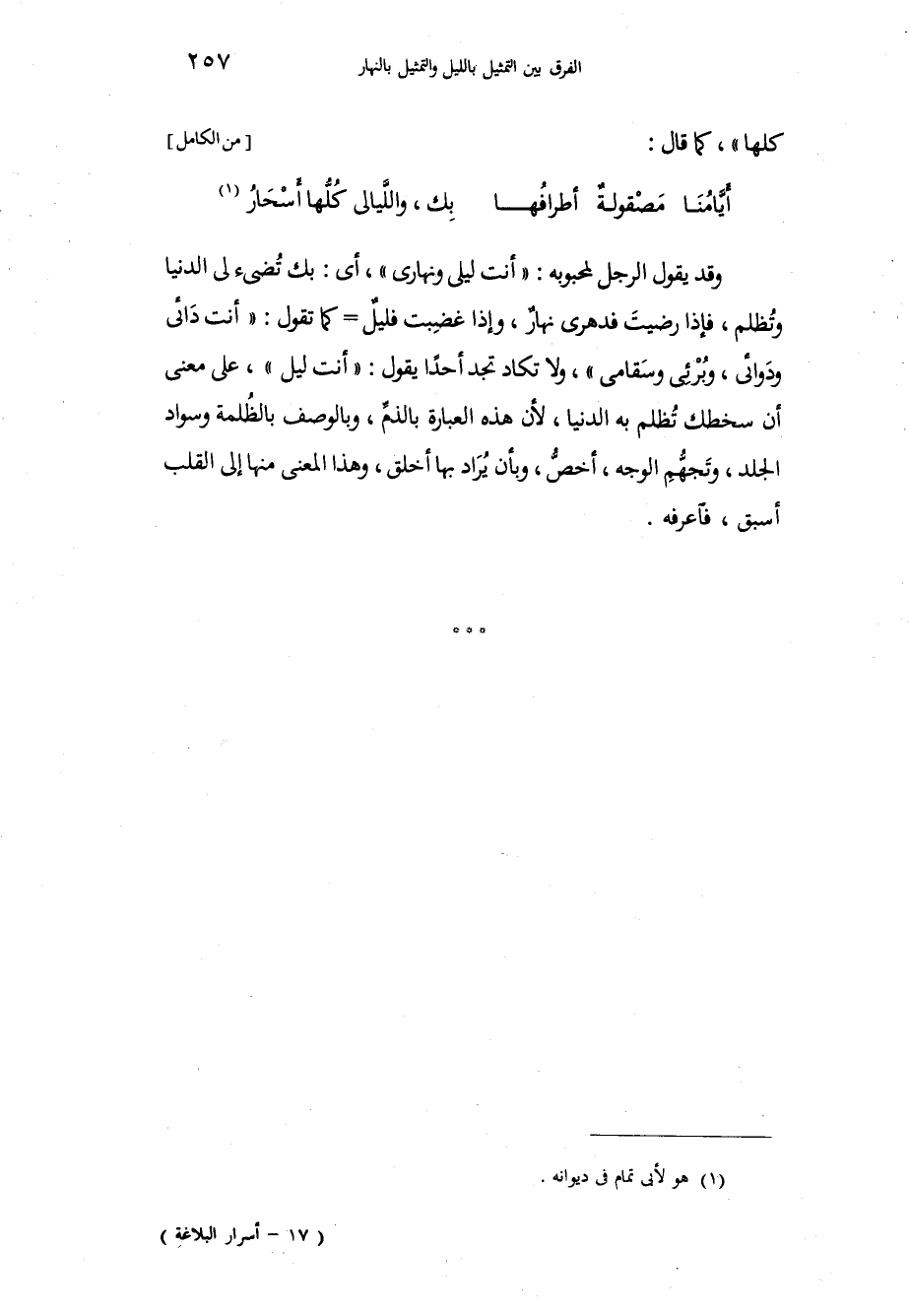 وقد يقول الرجل لمحبوبه أنت ليلى ونهارى، أي بك تُضيء لي الدنيا وتُظلم، فإذا رضيتَ فدهري نهارٌ، وإذا غضِبت فليلٌ كما تقول: أنت دَائي ودَوائي، وبُرْئٍي وسِقامي، ولا تكاد تجد أحدا يقول أنت ليل، على معنى أن سخطك تُظلم به الدنيا، لأن هذه العبارة بالذمِّ، وبالوصف بالظُلمة وسواد الجلد، وتَجهُّمِ الوجه، أخصُّ، وبأن يُرَاد بها أخلق، وهذا المعنى منها إلى القلب أسبق فاعرفه.