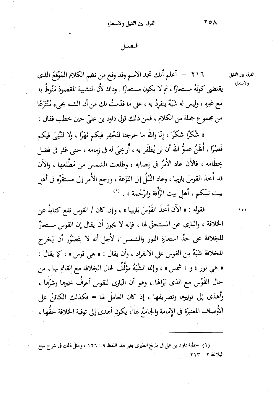 اعلم أنك تجد الاسم وقد وقع من نظم الكلام المَوْقعَ الذي يقتضي كونَهُ مستعاراً، ثم لا يكون مستعاراً، وذاك لأن التشبيهَ المقصودَ مَنُوطٌ به مع غيره، وليس له شَبَهٌ ينفرِدُ به، على ما قدّمتُ لك من أن الشبه يجيء مُنْتَزَعاً من مجموع جملة من الكلام، فمن ذلك قول داود بن عليّ حين خطب فقال شُكراً شكراً، إنّا واللَّه ما خرجنا لنَحْفِر فيكم نَهَراً، ولا لنَبْنِيَ فيكم قَصْراً، أَظَنَّ عدوُّ اللَّه أن لن يُظفَر به، أُرخيَ له في زِمامه، حتى عَثَر في فضل خطَامه، فالآن عاد الأمرُ في نِصابه، وطلعت الشمس من مَطْلعها، والآن قد أَخذ القوسَ باريها، وعاد النَّبْلُ إلى النَزَعة، ورجع الأَمر إلى مستقَرِّه في أهلِ بيت نبيّكم، أهلِ بيت الرَّأْفَة والرَّحْمة، فقوله الآن أخذَ القَوْسَ بَاريها، وإن كان القوس تقع كنايةً عن الخلافة، والبَاري عن المستحقّ لها، فإنه لا يجوز أن يقال إن القوس مستعارٌ للخلافة على حدِّ استعارة النور والشمس، لأجل أنه لا يتَصَوَّر أن يَخرج للخلافة شَبَهٌ من القول على الانفراد، وأن يقال: هي قوس، كما يقال: هي نور وشمس، وإنما الشَّبَهُ مؤلَّفٌ لحال الخِلافة مع القائم بها، من حال القَوْس مع الذي بَرَاهَا، وهو أن البَارِي للقوس أعرفُ بخيرها وشرّها، وأهدَى إلى توتيرها وتصريفها، إذ كان العاملَ لها فكذلك الكائنُ على الأوصاف المعتبرَة في الإمامة والجامعُ لها، يكون أهدى إلى توفية الخلافة حقَّها،