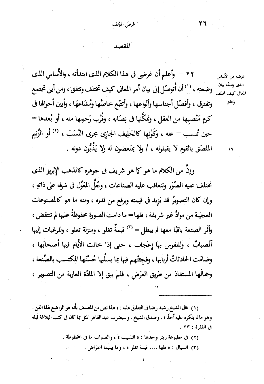واعلم أن غرضي في هذا الكلام الذي ابتدأته، والأساس الذي وضعته، أن أتوصّل إلى بيان أمر المعاني كيف تختلف وتتفق، ومن أين تجتمع وتفترق، وأفصل أجناسها وأنْواعها، وأتتبّع خاصّها ومُشَاعَها، وأبين أحوالها في كرم مَنْصبها من العقل، وتمكُّنَها في نِصَابه، وقُرْب رَحِمِها منه، أو بُعدها حين تُنسب عنه، وكَوْنِها كالحَلِيف الجارِي مجرى النَّسَبَ، أو الزَّنيم الملصَق بالقوم لا يقبلونه، ولا يمتعضون له ولا يَذُبُّون دونه، وإنّ من الكلام ما هو كما هو شريف في جوهره كالذهب الإبريز الذي تختلف عليه الصُوَر وتتعاقب عليه الصناعات، وجُلَّ المعَوَّل في شرفه على ذاتهِ، وإن كان التصويرُ قد يزِيد في قيمته ويرفع من قدره، ومنه ما هو كالمصنوعات العجيبة من موادَّ غير شريفة، فلها، ما دامت الصورة محفوظةً عليها لم تنتقض، وأثَر الصنعة باقيّاً معها لم يبطل قيمةٌ تغلو، ومنزلة تعلو، وللرغبة إليها انْصبابٌ، وللنفوس بها إعجاب، حتى إذا خانت الأيام فيها أصحابَها، وضامَت الحادثاتُ أربابها، وفجعتهم فيها بما يسلُب حُسْنها المكتسب بالصَّنعة، وجمالَها المستفادَ من طريق العَرضِ، فلم يبق إلا المادّة العارية من التصوير،