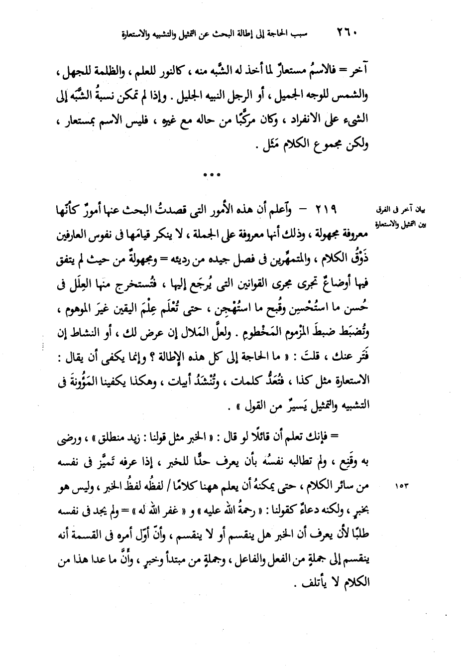 آخر فالاسمُ مستعارٌ لما أخذ له الشَّبه منه، كالنور للعلم والظلمة للجهل، والشمس للوجه الجميل، أو الرجل النبيه الجليل، وإذا لم تكن نسبةُ الشَّبَه إلى الشيء على الانفراد، وكان مركَّباً من حاله مع غيره، فليس الاسم بمستعار، ولكن مجموع الكلام مَثَل. واعلم أن هذه الأمور التي قصدتُ البحث عنها أمورٌ كأنّها معروفة مجهولة، وذلك أنها معروفة على الجملة، لا ينكر قيامَها في نفوس العارفين ذَوْقُ الكلام، والمتمهّرين في فصل جيده من رديئه، ومجهولةٌ من حيث لم يتفق فيها أوضاعٌ تجري مجرى القوانين التي يُرجَع إليها، فتُستخرج منها العلَل في حُسن ما استُحْسِن وقُبح ما استُهْجن، حتى تُعْلَم عِلْمَ اليقين غيرَ الموهوم، وتُضبَط ضبطَ المزْموم المَخْطومِ، ولعلَّ المَلال إن عرض لك، أو النشاط إن فَتَر عنك، قلتَ ما الحاجة إلى كل هذه الإطالة؟ وإنما يكفي أن يقال الاستعارة مثل كذا، فتُعَدُّ كلمات، وتُنْشَدُ أبيات، وهكذا يكفينا المَؤُونةَ في التشبيه والتمثيل يَسيرٌ من القول