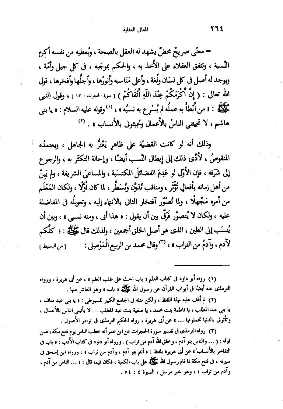 معنًى صريحٌ محضٌ يشهد له العقل بالصحة، ويُعطيه من نفسه أكرم النِّسبة، وتتفق العقلاء على الأخذ به، والحكم بموجَبه، في كل جيل وأمّة، ويوجد له أصل في كل لسَان ولُغة، وأعلى مَنَاسبه وأنورُها، وأجلُّها وأفخرها، قول اللَّه تعالى: " إنَّ أَكْرَمَكُمْ عِنْدَ اللَّه أَتْقَاكُمْ " " " الحجرات: 13 "، وقول النبي صلى الله عليه وسلم: " من أَبْطأَ به علمُه لم يُسْرِع به نسبُه "، وقوله عليه السلام: " يا بني هاشم، لا تجيئني الناسُ بالأعمال وتجيئوني بالأنساب "، وذلك أنه لو كانت القضيّة على ظاهرٍ يَغْترُّ به الجاهل، ويعتمدُه المنقوصُ، لأدَّى ذلك إلى إبطال النَّسب أيضاً، وإحالة التكثّر به، والرجوع إلى شَرَفه، فإن الأوّل لو عَدِمَ الفضائلَ المكتسَبة، والمساعيَ الشريفة، ولم يَبِنْ من أهل زمانه بأفعالٍ تُؤَْثر، ومناقب تُدَوَّن وتُسَطَّر، لما كان أَوَّلاً، ولكان المَعْلَم من أمره مَجْهلاً، ولما تُصُوّر افتخار الثاني بالانتماء إليه، وتعويلُه في المفاضلة عليه، ولكان لا يُتصوَّر فَرْقٌ بين أن يقول: هذا أبي، ومنه نسبي، وبين أن يُنسَب إلى الطين، الذي هو أصل الخلق أجمعين، ولذلك قال صلى الله عليه وسلم: " كلُّكم لآدم، وآدمُ من التراب "، وقال محمد بن الربيع الْمَوْصلي: