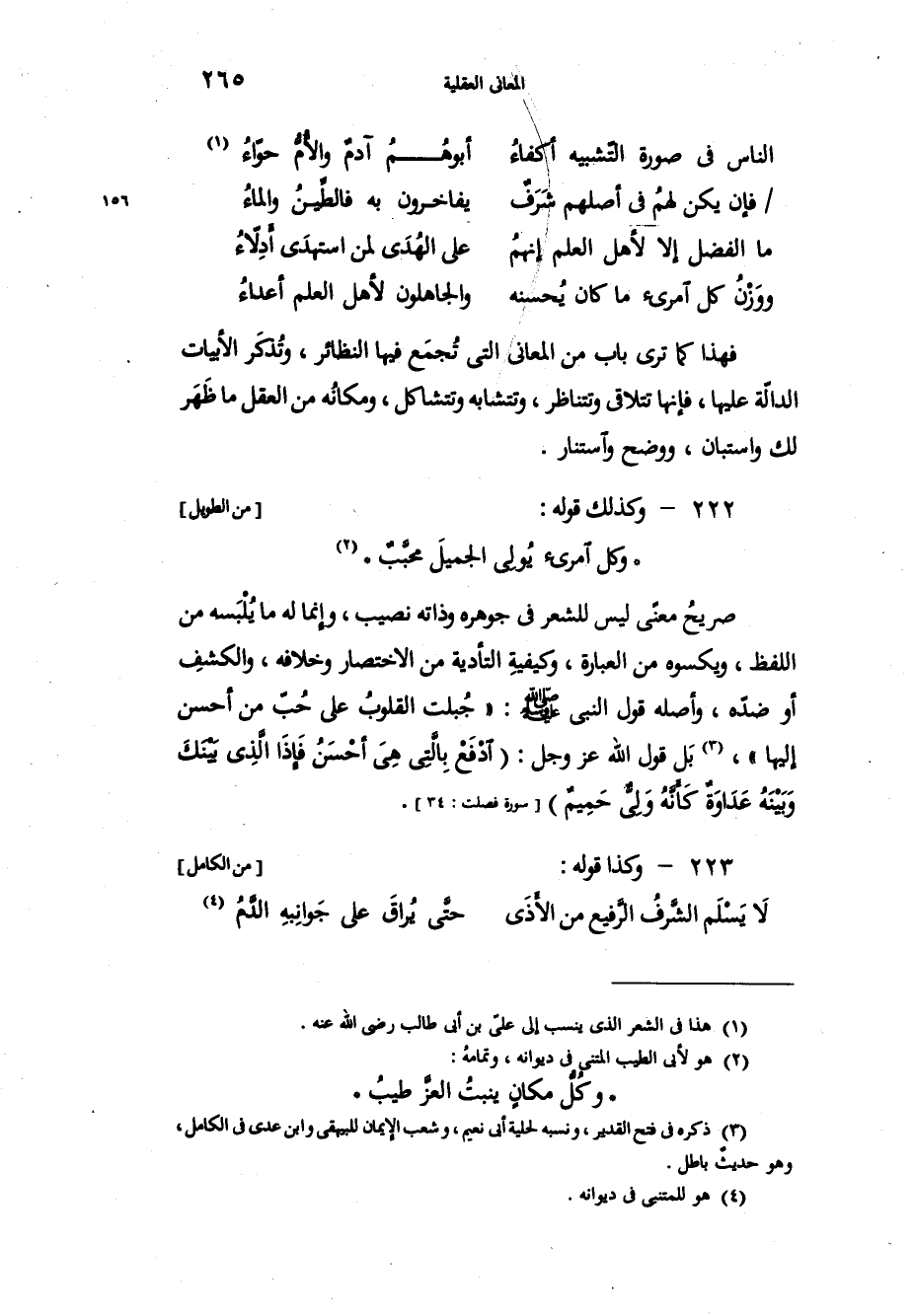 صريحُ معنًى ليس للشعر في جوهره وذاته نصيب، وإنما له ما يُلْبَسه من اللفظ، ويكسوه من العبارة، وكيفيةِ التأدية من الاختصار وخلافه، والكشف أو ضدّه، وأصله قول النبي صلى الله عليه وسلم: " جُبلت القلوبُ على حُبّ من أحسن إليها "، بَل قول اللَّه عز وجل: " ادْفَعْ بالَّتِي هِيَ أحْسَنُ فَإذَا الَّذِي بَيْنَكَ وَبَيْنَهُ عَدَاوَةٌ كَأَنَّهُ وَلِيٌّ حَمِيمٌ " " فصلت: 34 "، وكذا قوله: