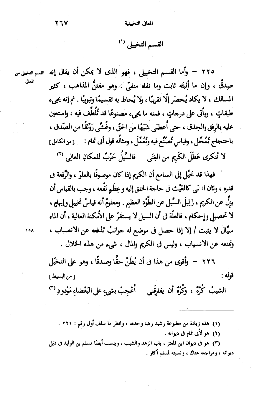 وأما القسم التخييلي، فهو الذي لا يمكن أن يقال إنه صِدقٌ، وإنَّ ما أثبتَه ثابت وما نفاه منفيّ، وهو مفتنُّ المذاهب، كثير المسالك، لا يكاد يُحصَر إلاّ تقريباً، ولا يُحاط به تقسيماً وتبويباً، ثم إنه يجيء طبقاتٍ، ويأتي على درجاتٍ، فمنه ما يجيء مصنوعاً قد تُلُطِّف فيه، واستعين عليه بالرِفق والحِذق، حتى أُعطَي شَبَهاً من الحقّ، وغُشِّي رَوْنَقاً من الصّدق، باحتجاج تُمُحِّل، وقياسٍ تُصُنِّع فيه وتُعُمِّلَ، ومثالُه قول أبي تمام:
