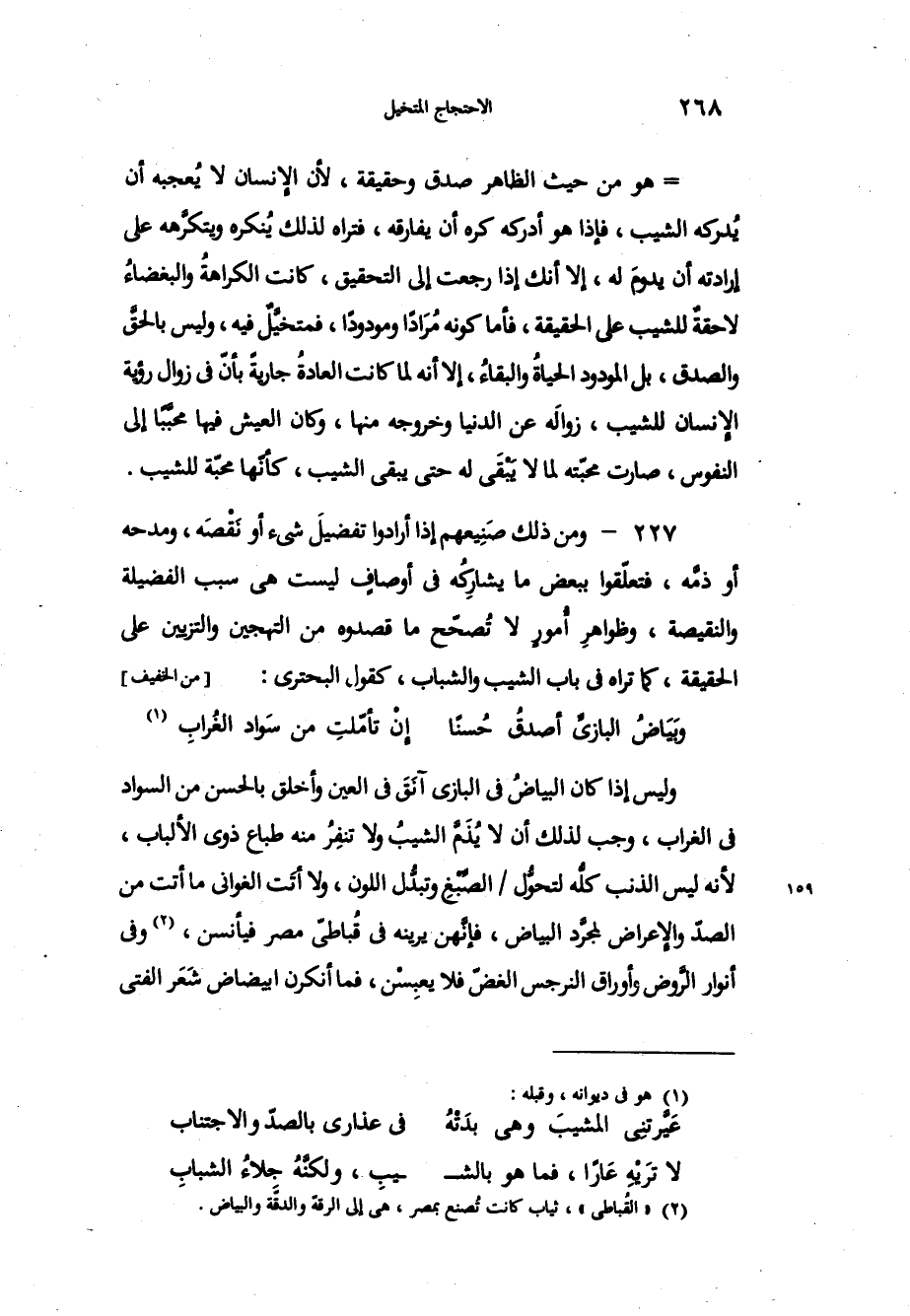 هو من حيث الظاهر صدق وحقيقة، لأن الإنسان لا يعجبه أن يُدركه الشيب، فإذا هو أدركه كره أن يفارقه، فتراه لذلك يُنكره ويتكرَّهه على إرادته أن يدومَ له، إلا أنك إذا رجعت إلى التحقيق، كانت الكراهةُ والبغضاء لاحقةُ للشيب على الحقيقة، فأما كونه مُرَاداً ومودوداً، فمتخيَّلٌ فيه، وليس بالحقَّ والصدق، بل المودود الحياة والبقاءُ، إلا أنه لما كانت العادة جاريةً بأنّ في زوال رؤية الإنسان للشيب، زوالَه عن الدنيا وخروجه منها، وكان العيش فيها محبَّباً إلى النفوس، صارت محبّته لما لا يَبْقَى له حتى يبقى الشيب، كأنّها محبّة للشيب. من ذلك صَنِيعهم إذا أرادوا تفضيلَ شيء أو َقْصَه، ومدحه أو ذمَّه، فتعلّقوا ببعض ما يشاركُه في أوصافٍ ليست هي سبب الفضيلة والنقيصة، وظواهرِ أُمورٍ لا تَصحّح ما قصدوه من التهجين والتزيين على الحقيقة، كما تراه في باب الشيب والشباب، كقول البحتري: