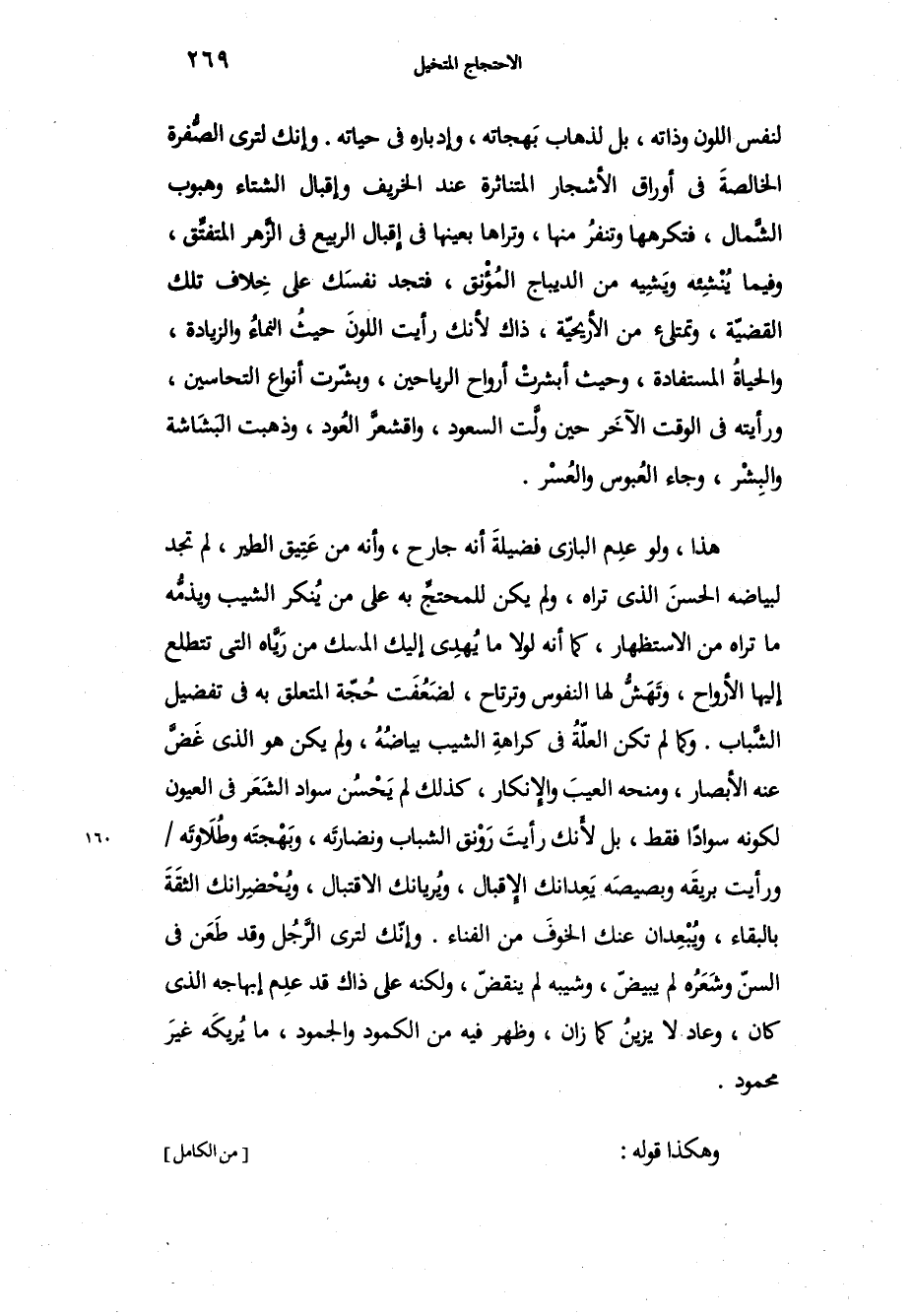 لنفس اللون وذاته، بل لذهاب بَهجاته، وإدباره في حياته، وإنك لترى الصُّفرة الخالصةَ في أوراق الأشجار المتناثرة عند الخريف وإقبال الشتاء وهبوب الشَّمال، فتكرهها وتنفرُ منها، وتراها بعينها في إقبال الربيع في الزَّهر المتفتِّق، وفيما ينْشئه ويَشِيه من الديباج المُؤْنق، فتجد نفسَك على خِلاف تلك القضيّة، وتمتلئ من الأريحيّة، ذاك لأنك رأيت اللونَ حيُ النماءُ والزيادة، والحياةُ المستفادة، وحيث أبشرتْ أرواح الرياحين، وبشّرت أنواع التحاسين، ورأيته في الوقت الآخَر حين ولَّت السعود، واقشعرَّ العُود، وذهبت البَشَاشة والبشْر، وجاء العُبوس والعُسْر. هذا ولو عدِم البازي فضيلةَ أنه جارح، وأنه من عَتيق الطير، لم تجد لبياضه الحسن الذي تراه، ولم يكن للمحتجِّ به على من يُنكر الشيب ويذمُّه ما تراه من الاستظهار، كما أنه لولا ما يُهدي إليك المسك من رَيَّاه التي تتطلع إلها الأرواح، وتَهَشُّ لها النفوس وترتاح، ولضَعُفَت حُجّة المتعلق به في تفضيل الشَّباب، وكما لم تكن العلّةُ في كراهةِ الشيب بياضُهُ، ولم يكن هو الذي غَضَّ عنه الأبصار، ومنحه العيبَ والإنكار، كذلك لم يَحْسن سواد الشَعَر في العيون لكونه سواداً فقط، بل لأَنك رأيتَ رَوْنق الشباب ونضارتَه، وبَهْجتَه وطُلاَوتَه وَرأيت بريقَه وبصيصَه يَعِدانك الإقبال، ويُريانك الاقتبال، ويُحْضِرانك الثقَةَ بالبقاء، ويُبْعِدان عنك الخوفَ من الغناء، وإنّك لترى الرَّجُل وقد طَعَن في السنّ وشَعَرُه لم يبيضّ، وشيبه لم ينقضّ، ولكنه على ذاك قد عدِم إبهاجه الذي كان، وعاد لا يزينُ كما زان، وظهر فيه من الكمودوالجمود، ما يُريكَه غيرَ محمود. وهكذا قوله: