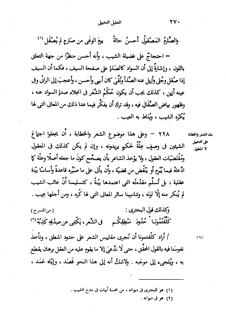 احتجاجٌ على فضيلة الشيب، وأنه أحسن منظراً من جهة التعلق باللون، وإشارةٌ إلى أن السواد كالصَدَأ على صفحة السيف، فكما أن السيف إذا صُقل وجُلي وأزيل عنه الصَّدَأ ونُقِّيَ كان أبهى وأحسن، وأعجبَ إلى الرائي وفي عينه أزين، كذلك يجب أن يكون حُكْمُ الشعَر في انجلاء صدأ السواد عنه، وظهور بياض الصِّقَالِ فيه، وقد ترك أن يفكّر فيما عدا ذلك من المعاني التي لها يُكرَه الشيب، ويُنَاط به العيب. وعلى هذا موضوع الشعر والخطابة، أن يجعلوا اجتماعَ الشيئين في وصفٍ عِلةً لحكمٍ يريدونه، وإن لم يكن كذلك في المعقول ومُقْتَضَيَات العقول، ولا يؤخذ الشاعر بأن يصحِّح كونَ ما جعله أصلاً وعلّة كما ادَّعاهُ فيما يُبْرِم أو يَنْقض من قضيّة، وأَن يأتي على ما صَيَّره قاعدةً وأساساً بيّنة عقلية، بل تُسلَّم مقدّمتُه التي اعتمدها بيّنةً، كتسليمنا أَنّ عائب الشيب لم ينكر منه إلاّ لونَه، وتناسِينا سائر المعاني التي لها كُره، ومن أجلها عِيب، وكذلك قول البحتري: