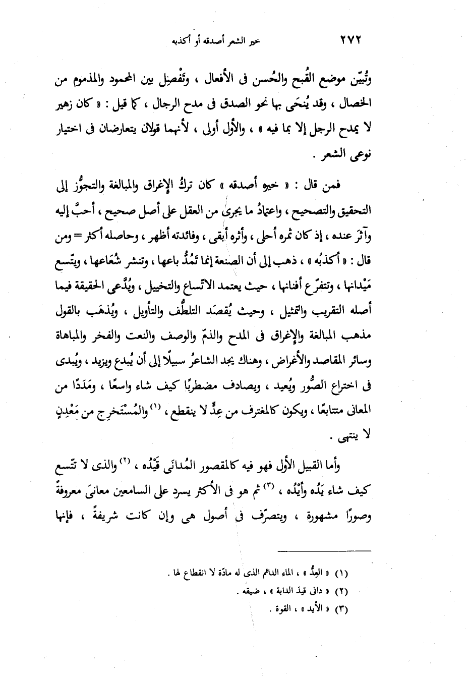 وتُبيّن موضع القُبح والحُسن في الأفعال، وتَفْصل بين المحمود والمذموم من الخصال، وقد يُنحَى بها نحو الصدق في مدح الرجال، كما قيل: كان زهير لا يمدح الرجل إلا بما فيه، والأول أولى، لأنهما قولان يتعارضان في اختيار نوعي الشعر. فمن قال خيره أصدقه كان تركُ الإغراق والمبالغة والتجوُّز إلى التحقيق والتصحيح، واعتمادُ ما يجرى من العقل على أصل صحيح، أحبَّ إليه وآثرَ عنده، إذ كان ثمره أحلى، وأثره أبقى، وفائدته أظهر، وحاصله أكثر، ومن قال أكذبُه، ذهب إلى أن الصنعة إنما تَمُدُّ باعها، وتنشر شُعَاعها، ويتّسع مَيْدانها، وتتفرّع أفنانها، حيث يعتمد الاتّساع والتخييل، ويُدَّعى الحقيقة فيما أصله التقريب والتخيل وحيث يُقصَد التلطف والتأويل ويذهب بالقول مذهب المبالغة والإغراق في المدح والذمّ والوصف والنعت والفخر والمباهاة وسائر المقاصد والأغراض، وهناك يجد الشاعرُ سبيلاً إلى أن يُبدع ويزيد، ويُبدي في اختراع الصّور ويُعيد، ويصادف مضطرباً كيف شاء واسعاً، ومَدَداً من المعاني متتابعاً، ويكون كالمغترف من عِدٍّ لا ينقطع، والمُسْتَخرج من مَعْدِنٍ لا ينتهي. وأما القبيل الأول فهو فيه كالمقصور المُدانَى قَيْدُه، والذي لا تتّسع كيف شاء يَدُه وأيْدُه، ثم هو في الأكثر يسرد على السامعين معانىَ معروفةً وصوراً مشهورة، ويتصرّف في أصول هي وإن كانت شريفةً، فإنها