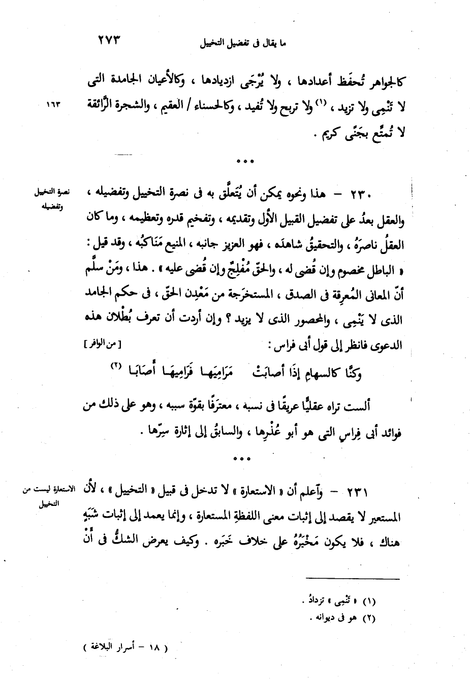 ألست تراه عقليّاً عريقاً في نسبه، معترَفاً بقوّة سببه، وهو على ذلك من فوائد أبي فراسٍ التي هي أبو عُذْرِها، والسابق ُإلى إثارة سِرّها، واعلم أن الاستعارة لا تدخل في قبيل التخييل، لأن المستعير لا يقصد إلى إثبات معنى اللفظةِ المستعارة، وإنما يعمد إلى إثبات شَبَهٍ هناك، فلا يكون مَخْبَرُهُ على خلاف خَبَره، وكيف يعرض الشكُّ في أَنْ