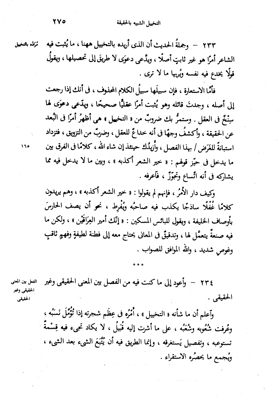 وجملة الحديث أن الذي أريده بالتخييل ها هنا، ما يُثبت فيه الشاعر أمراً هو غير ثابتٍ أصلاً، ويدَّعي دعوَى لا طريقَ إلى تحصيلها، ويقولُ قولاً يخدع فيه نفسه ويُريها ما لا ترى، فأمَّا الاستعارة فإن سبيلَها سبيلُ الكلام المحذوف، في أنك إذا رجعت إلى أصله، وجدتَ قائله وهو يُبت أمراً عقليّاً صحيحاً، ويدّعي دعوَى لها سِنْخٌ في العقل، وستمرُّ بك ضروبٌ من التخييل هي أظهرُ أمراً في البُعد عن الحقيقة، وأكشفُ وجهاً في أنه خداعٌ للعقل، وضربٌ من التزويق، فتزداد استبانة للغَرَض بهذا الفصل، وأَزيدُك حينئذ إن شاء اللَّه، كلاماً في الفرق بين ما يدخل في حيّز قولهم خير الشعر أكذبه، وبين ما لا يدخل فيه مما يشاركه في أنه اتِّساع وتجوّزٌ فاعرفه. وكيف دار الأمرُ فإنهم لم يقولوا خير الشعر أكذبه، وهم يريدون كلاماً غُفْلاً ساذجاً يكذب فيه صاحبُه ويُفْرِط، نحو أن يصف الحارسَ بأوصاف الخليفة، ويقول للبائس المسكين إنّك أمير العِرَاقَيْن، ولكن ما فيه صنعةٌ يتعمَّل لها، وتدقيقٌ في المعاني يحتاج معه إلى فطنة لطيفةٍ وفهمٍ ثاقبٍ وغوصٍ شديد، واللَّه الموافق للصواب، وأعود إلى ما كنت فيه من الفصل بين المعنى الحقيقي وغير الحقيقي. واعلم أن ما شأنه التخييل، أمْرُه في عِظَم شجرته إذا تُؤُمِّلَ نَسَبُه، وعُرفت شُعُوبه وشُعَبُه، على ما أشرت إليه قُبَيلُ، لا يكاد تجيء فيه ِقِسْمةٌ تستوعبه، وتفصيل يَستغرقه، وإنما الطريق فيه أن يُتَّبَعَ الشيء بعد الشيءِ ويُجمع ما يحصُره الاستقراء،
