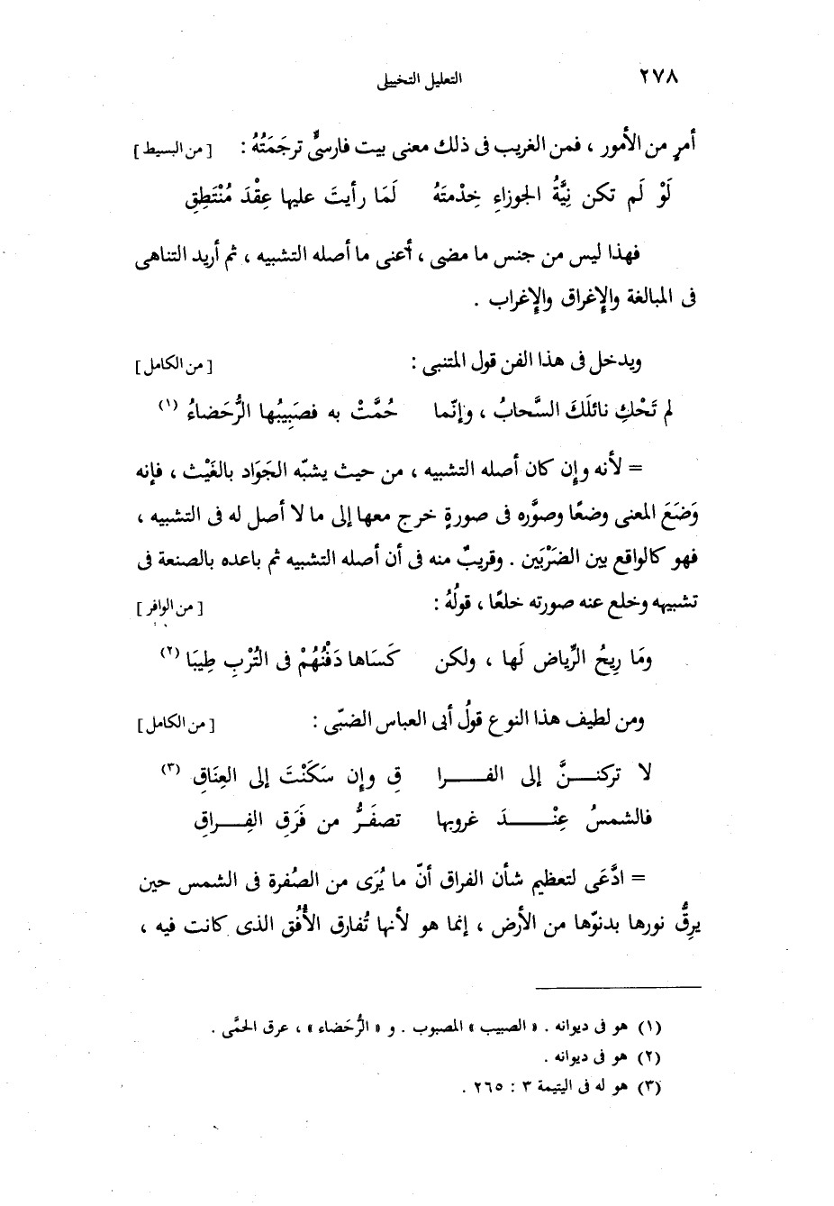 فهذا ليس من جنس ما مضى، أعني ما أصله التشبيه، ثم أريد التناهي في المبالغة والإغراق والإغراب. ويدخل في هذا الفن قول المتنبي: