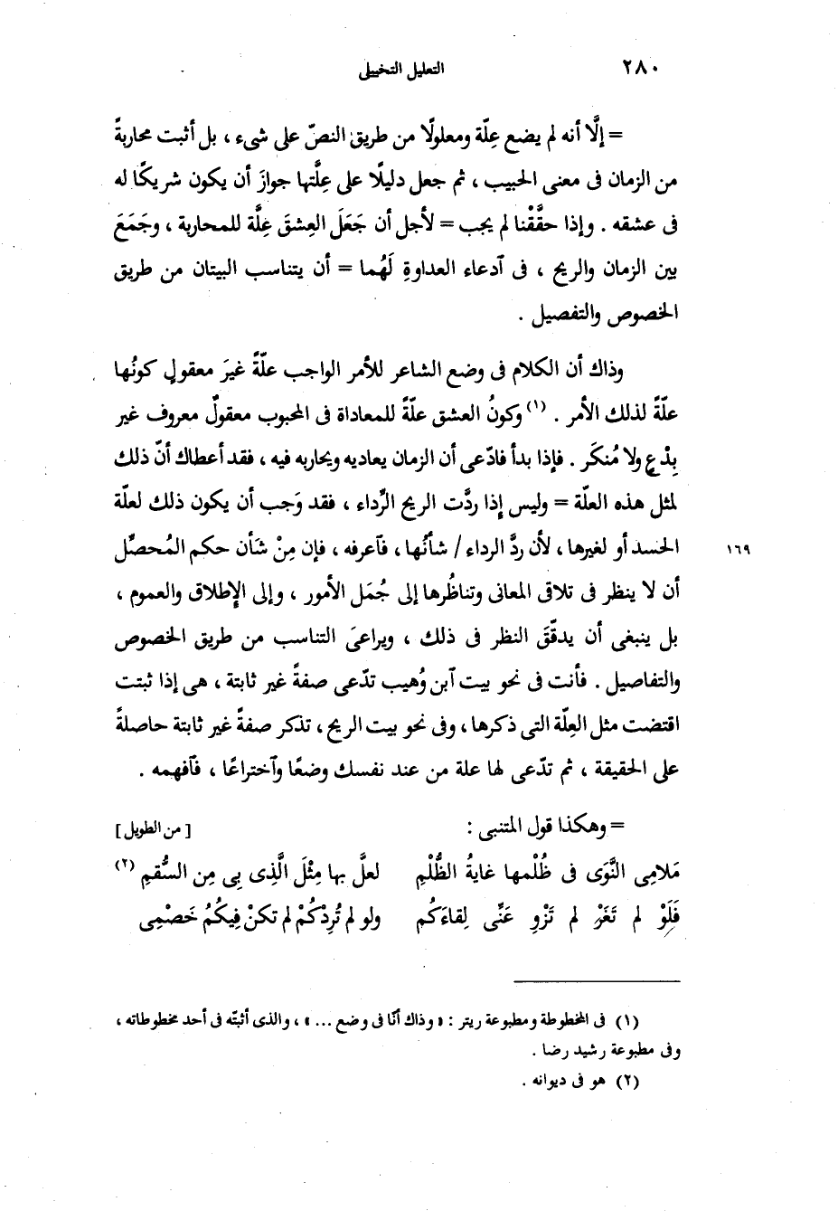 إلاَّ أنه لم يضع عِلّة ومعلولاً من طريق النصّ على شيء، بل أثبت محاربةً من الزمان في معنى الحبيب، ثم جعل دليلاً على عِلَّتها جوازَ أن يكون شريكاً له في عشقه، وإذا حقَّقْنا لم يجب لأجل أن جَعَلَ العِشقِ عِلَّة للمحاربة، وجَمَع بين الزمان والريح، في ادعاء العداوةِ لَهُما أن يتناسب البيتان من طريق الخصوص والتفصيل. وذاك أن الكلام في وضع الشاعر للأمر الواجب علّةً غيرَ معقولٍ كونُها علّةً لذلك الأمر، وكونُ العشق علّةً للمعاداة في المحبوب معقولٌ معروف غير بِدْعٍ ولا مُنكَر، فإذا بدأ فادّعى أن الزمان يعاديه ويحاربه فيه، فقد أعطاك أنّ ذلك لمثل هذه العلّة وليس إذا ردَّت الريح الرِّداء، فقد وَجب أن يكون ذلك لعلّة الحسد أو لغيرها، لأن ردَّ الرداء شأنُها، فاعرفه، فإن مِنْ شَأن حكم المُحصِّل أن لا ينظر في تلاقي المعاني وتناظُرها إلى جُمَل الأمور، وإلى الإطلاق والعموم، بل ينبغي أن يدقّقَ النظر في ذلك، ويراعَى التناسب من طريق الخصوص والتفاصيل، فأنت في نحو بيت ابن وُهيب تدّعى صفةً غير ثابتة، وهي إذا ثبتت اقتضت مثل العِلّة التي ذكرها، وفي نحو بيت الريح، تذكر صفةً غير ثابتة حاصلةً على الحقيقة، ثم تدّعي لها علة من عند نفسك وضعاً واختراعاً، فافهمه، وهكذا قول المتنبي:
