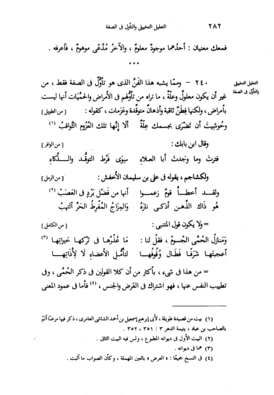 فمعك معنيان: أحدُهما موجودٌ معلومٌ، والآخرُ مُدَّعًى موهومٌ فاعرفه. وممّا يشبه هذا الفَنَّ الذي هو تأوُّلٌ في الصفة فقط، من غير أن يكون معلولٌ وعلّةٌ، ما تراه من تأوُّلهم في الأمراض والحمَّيَات أنها ليست بأمراض، ولكنها فِطَنٌ ثاقبة وأذهانٌ متوقِّدة وعَزَمات، كقوله: