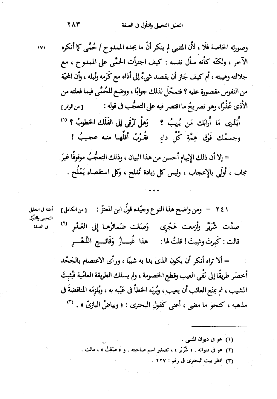 وصورته الخاصة فلاَ، لأن المتنبي لم ينكر أنه ما يجده الممدوح حُمَّى كما أنكره الآخر، ولكنّه كأنه سأل نفسه كيف اجترأت الحمَّى على الممدوح، مع جلالته وهيبته، أم كيف جَاز أن يقصد شيءٌ إلى أذاه مع كَرَمه ونُبله، وأن المحبّة من النفوس مقصورة عليه؟ فتحمَّلَ لذلك جواباً، ووضع للحُمَّى فيما فعلته من الأذى عُذْراً، وهو تصريحُ ما اقتصر فيه على التعجُّب في قوله: