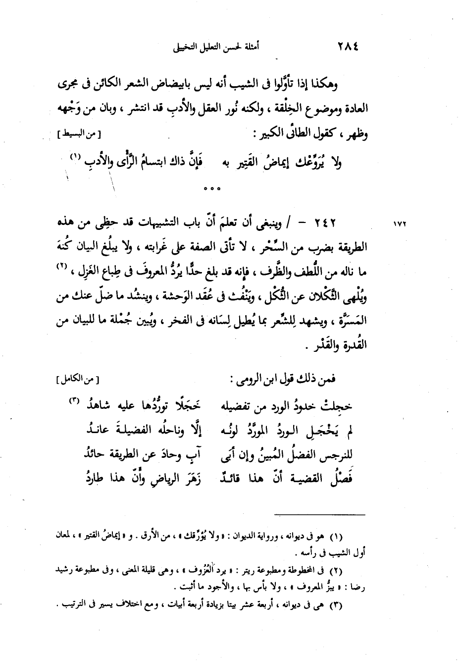 وينبغي أن تعلمَ أنّ باب التشبيهات قد حظِي من هذه الطريقة بضرب من السِّحْر، لا تأتي الصفة على غَرابته، ولا يبلُغ البيان كُنَه ما ناله من اللُّطف والظَّرف، فإنه قد بلغ حدّاً يرُدُ لمعروفَ في طِباع الغَزِل، ويُلْهى الثَّكْلان من الثُّكْل، ويَنْفُث في عُقَد الوَحشة، وينشُد ما ضلّ عنك من المسَرَّةِ، ويشهد لِلشِّعر بما يُطيل لِسَانه في الفخر، ويُبين جُمْلة ما للبيان من القُدرة والقَدْر، فمن ذلك قول ابن الرومي: