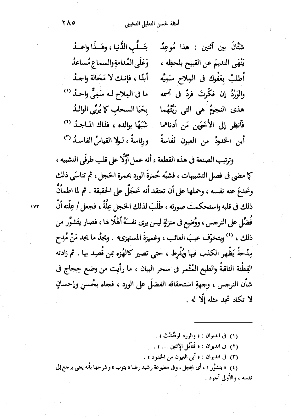 وترتيب الصنعة في هذه القطعة، أنه عمل أوَّلاً على قلب طرفَي التشبيه، كما مضى في فصل التشبيهات، فشبّه حُمرةَ الورد بحمرة الخجل، ثم تناسَى ذلك وخَدعَ عنه نفسه، وحملها على أن تعتقد أنه خَجَلٌ على الحقيقة، ثم لما اطمأنَّ ذلك في قلبه واستحكمت صورته، طَلَبَ لذلك الخجل عِلّةً، فجعل عِلَّته أنْ فُضِّل على النرجس، ووُضِع في منزلةٍ ليس يرى نفسَهُ أهْلاً لها، فصار يتَشوَّر من ذلك، ويتخوّف عيبَ العائب، وغميزةَ المستهزئ، ويجدُ ما يجد مَنْ مُدِح مِدْحةً يَظْهر الكذب فيها ويُفْرِط، حتى تصير كالهُزء بمن قُصِد بها، ثم زادته الفِطْنة الثاقبةُوالطبع المُثْمر في سحر البيان، ما رأيت من وضع حِجاج في شأن النرجس، وجهةِ استحقاقه الفضلَ على الورد، فجاء بحُسنٍ وإحسانٍ لا تكاد تجد مثله إلاّ له.
