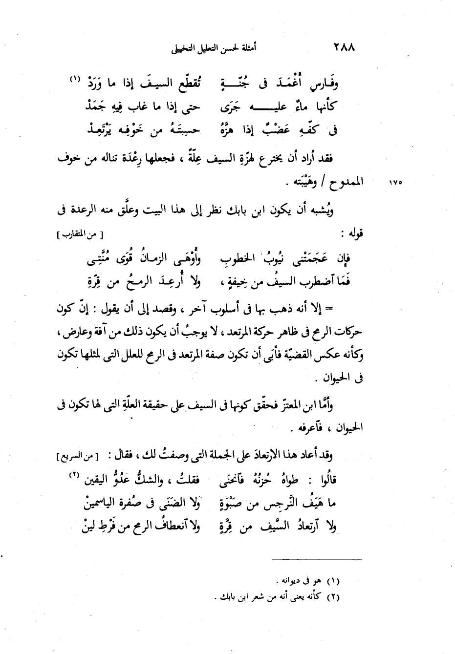 إلا أنه ذهب بها في أسلوب آخر، وقصد إلى أن يقول إنّ كون حركات الرمح في ظاهر حركة المرتعد، لا يوجبُ أن يكون ذلك من آفة وعارض، وكأنه عكس القضيّة فأبَى أن تكون صفة المرتعد في الرمح للعلل التي لمثلها تكون في الحيوان. وأمَّا ابن المعتزّ فحقّق كونها في السيف على حقيقة العلّةِ التي لها تكون في الحيوان فاعرفه. وقد أعاد هذا الارتعادَ على الجملة التي وصفتُ لك، فقال: