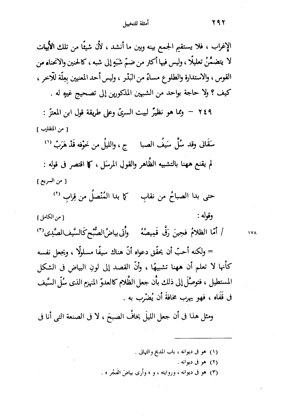 ولكنه أحبّ أن يحقّق دعواه أنّ هناك سيفاً مسلولاً، ويجعل نفسه كأنها لا تعلم أن هاهنا تشبيهاً، وأنّ القصد إلى لونِ البياضِ في الشكل المستطيل، فتوصَّلَ إلى ذلك بأَن جعل الظَّلام كالعدوّ المنهزم الذي سُلّ السَّيف في قَفَاه، فهو يهرب مخافَة أن يُضْرب به، ومثل هذا في أن جعل الليلَ يخافُ الصبحَ، لا في الصنعة التي أنا في