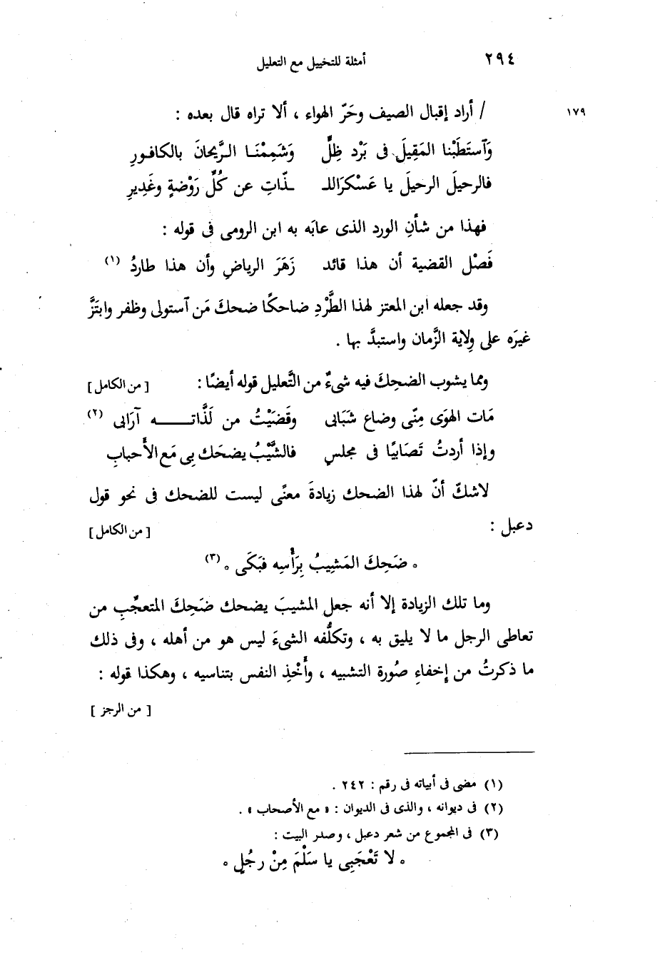 لا شكّ أن لهذا الضحك زيادةَ معنًى ليست للضحك في نحو قول دعبل: " ضَحِكَ المَشِيبُ بِرَأْسِه فبَكَى " وما تلك الزيادة إلا أنه جعل المشيبَ يضحك ضَحِكَ المتعجِّبِ من تعاطي الرجل ما لا يليق به، وتكلُّفه الشيءَ ليس هو من أهله، وفي ذلك ما ذكرتُ من إخفاءِ صُورة التشبيه، وأَخْذِ النفس بتناسيه، وهكذا قوله: