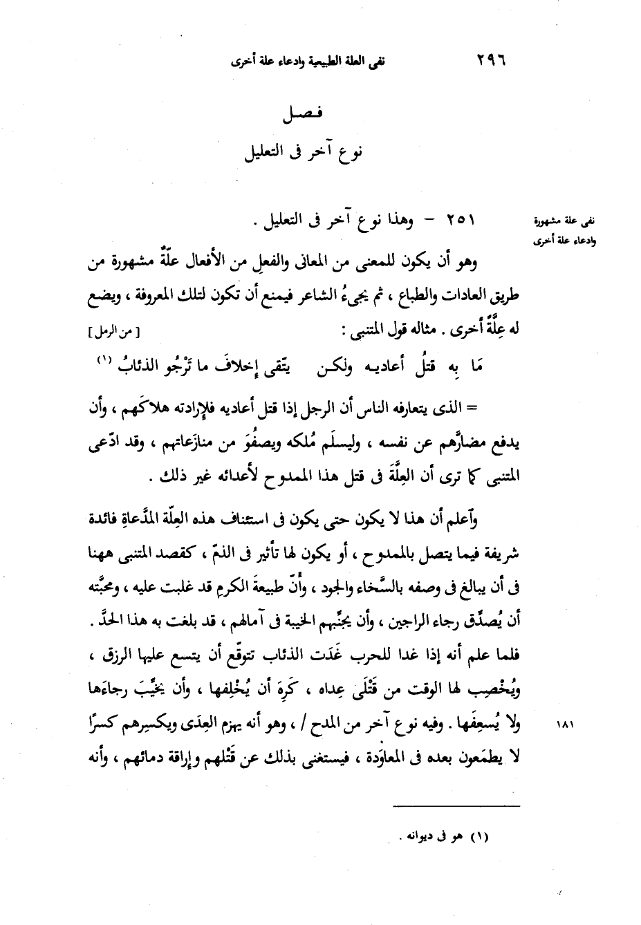 وهو أن يكون للمعنى من المعاني والفعلِ من الأفعال علّةٌ مشهورة من طريق العادات والطباع، ثم يجيءُ الشاعر فيمنع أن تكون لتلك المعروفة، ويضع له عِلَّةً أخرى، مثاله قول المتنبي:
